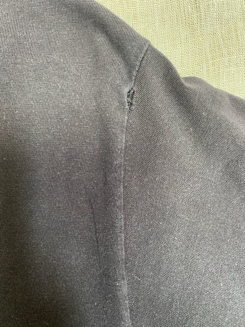 写真にもありますように、一部シミや汚れも多少ございます。袖の付け根、袖口に多少ほつれございます。