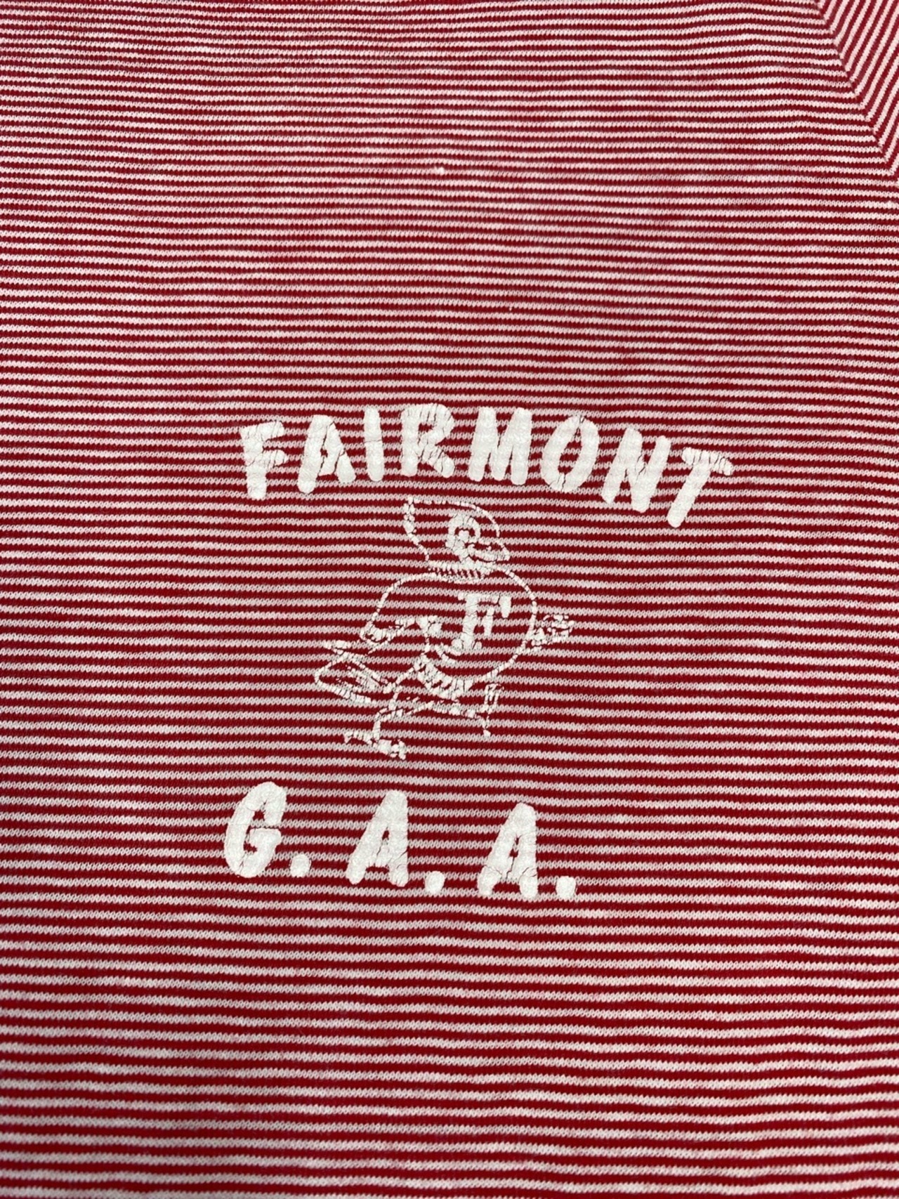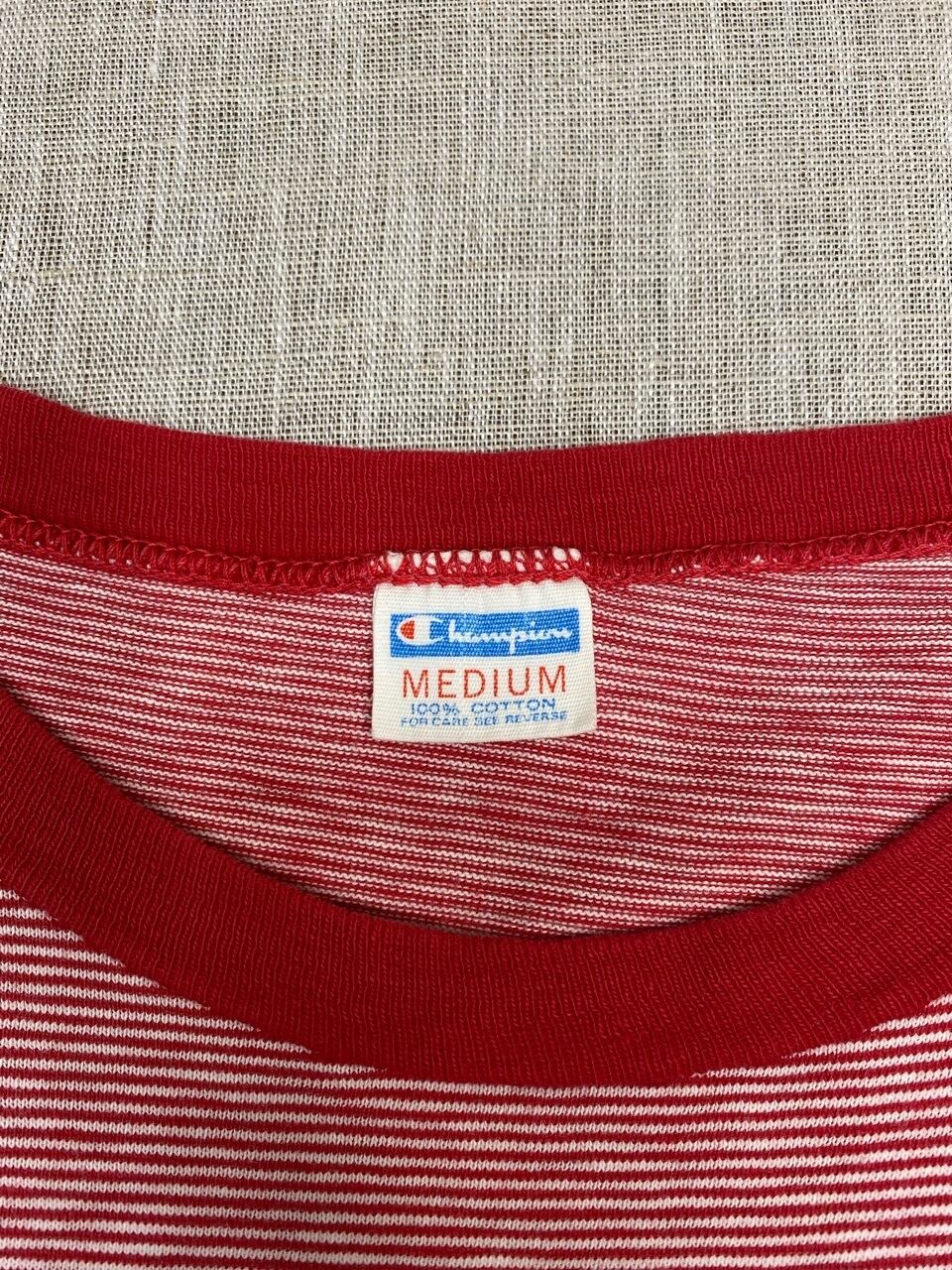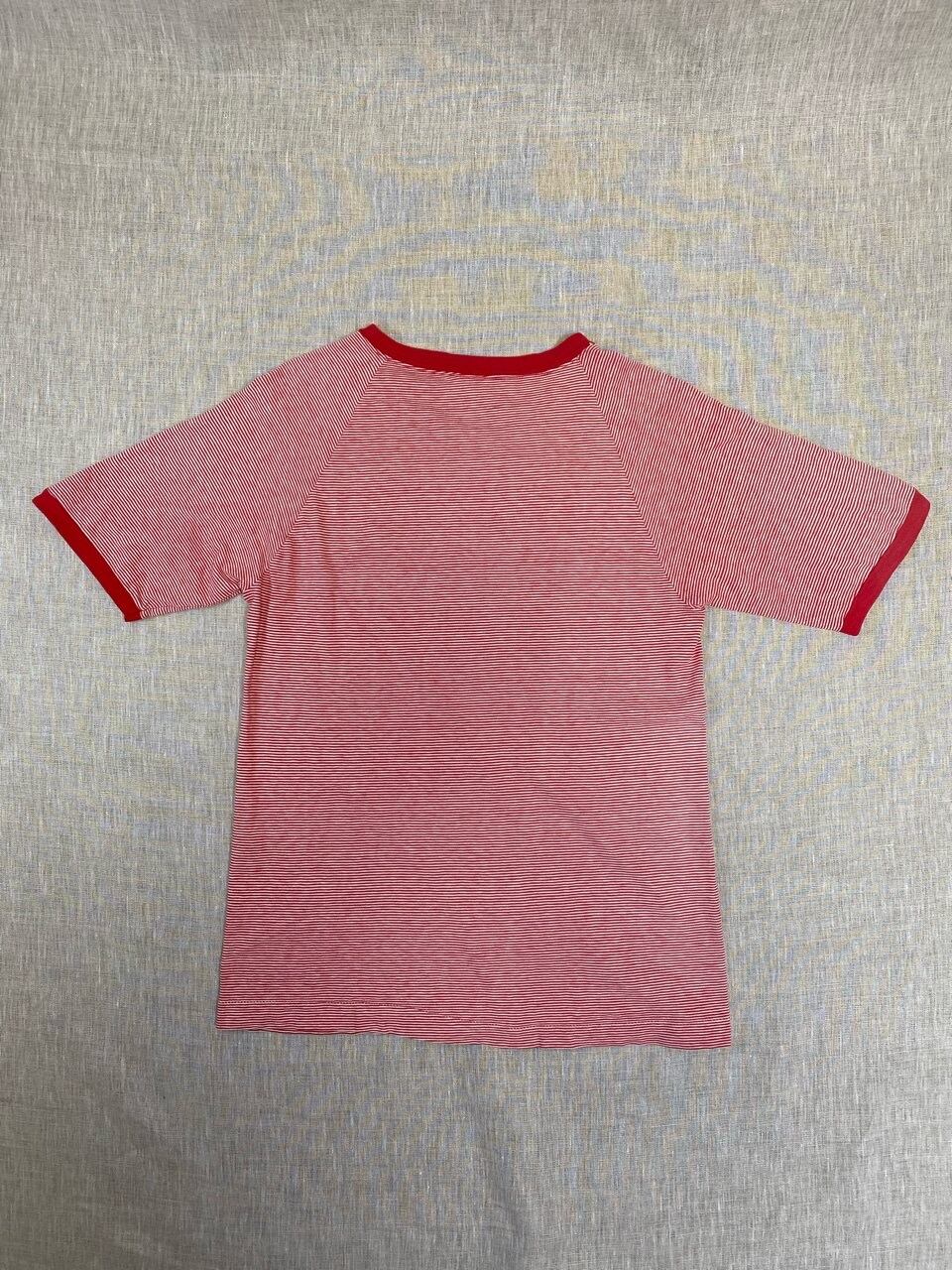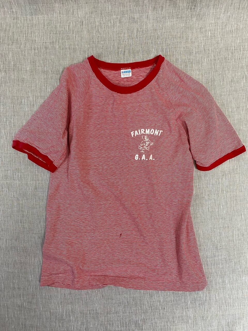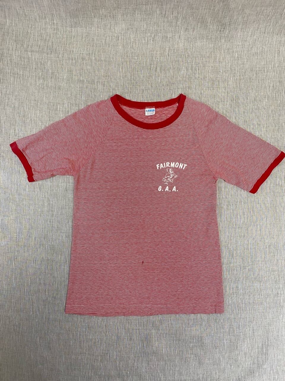 70年代のチャンピオンボーダーリンガーTシャツです。ボーダーは細めのピッチです。左胸にFAIRMONTとウェストバージニア州北部マリオン郡の都市の何かのチームプリントだと思います。サイズ小さめですので女性の方は是非。