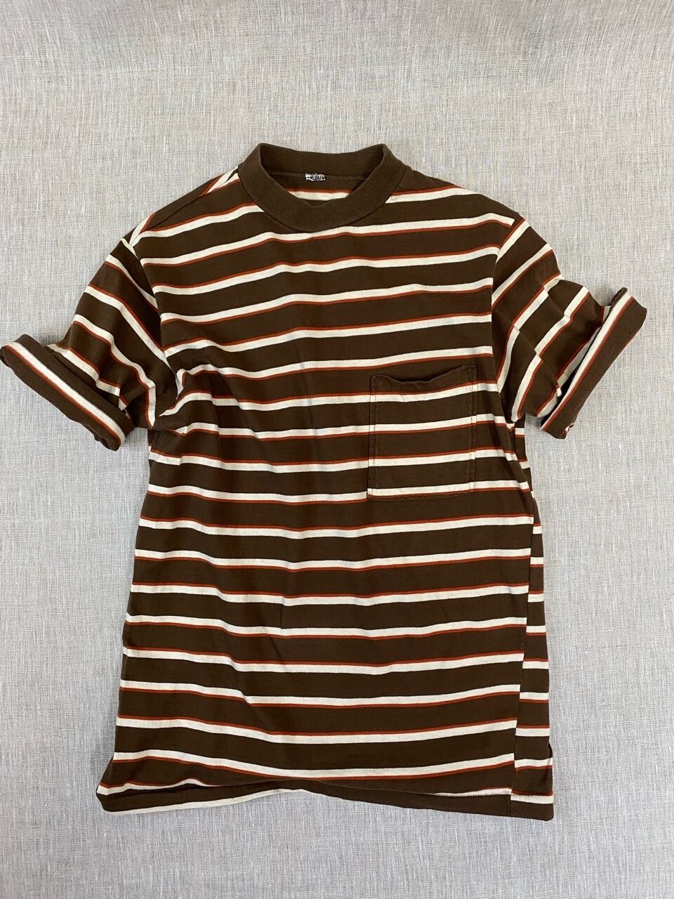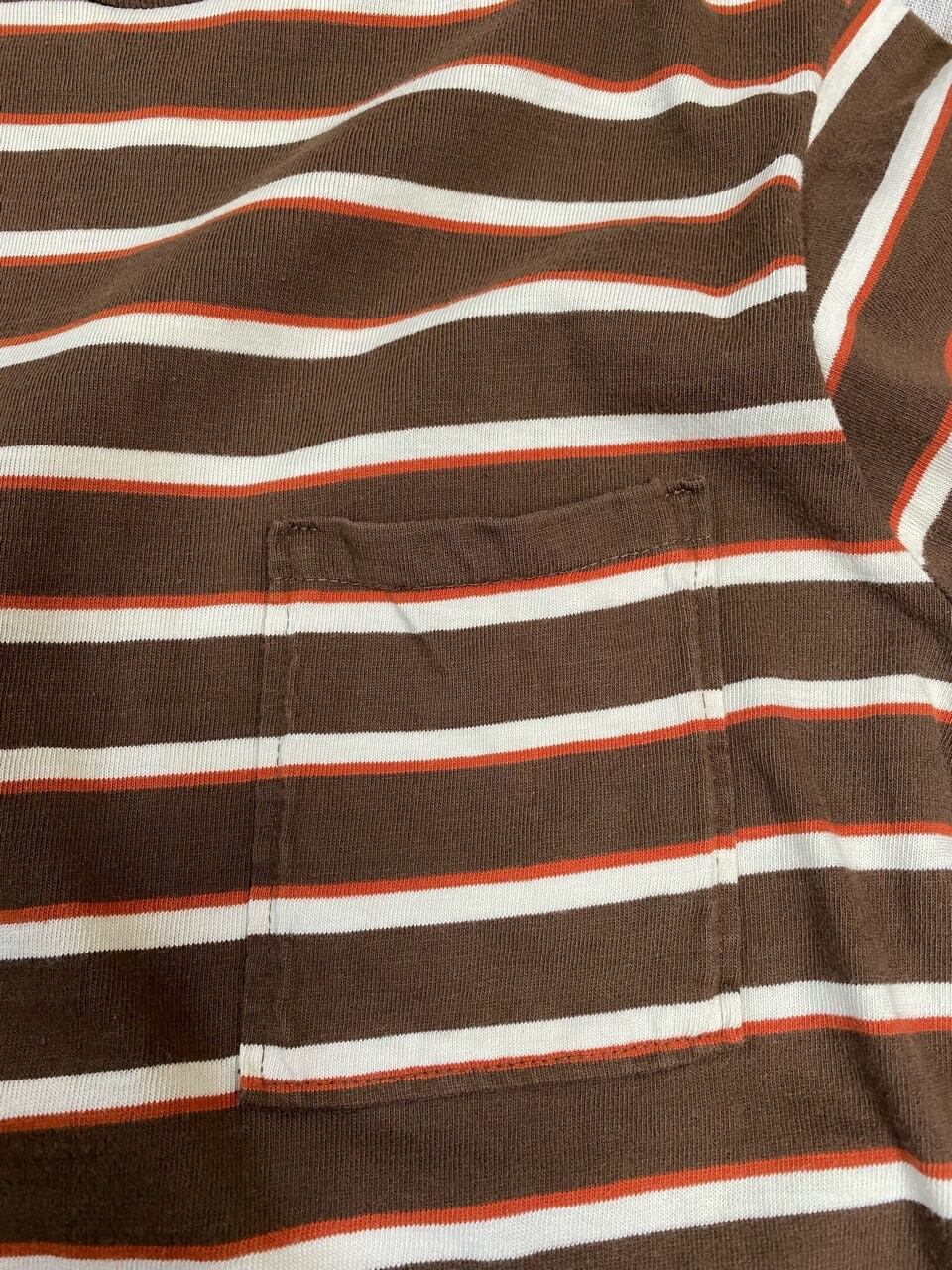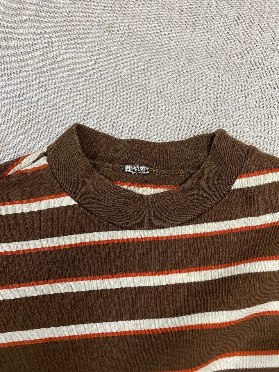 ネームなどがない為、ブランドや年代は不明ですが色合いや雰囲気がかわいいマルチボーダーTシャツです。袖が長めなので写真の様にロールアップをしていただくといいと思います。首元が細めのでサイズもタイトなので女性の方へオススメします。