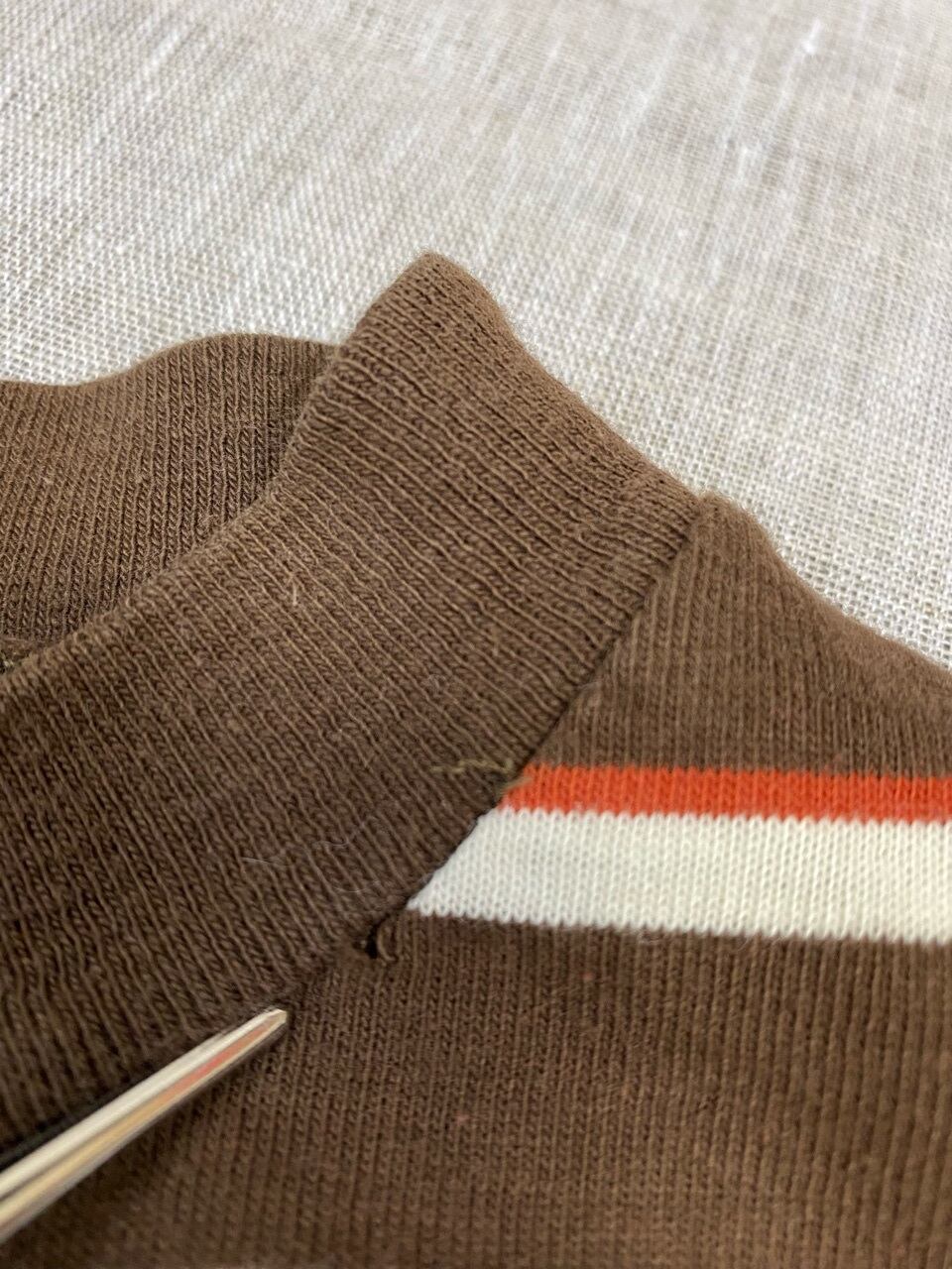 全体的に古着独特な褪せた感じです。写真にありますが袖や首元に小さな穴があります。裾の内側に下がってが少しホツレあります。ご確認ください。