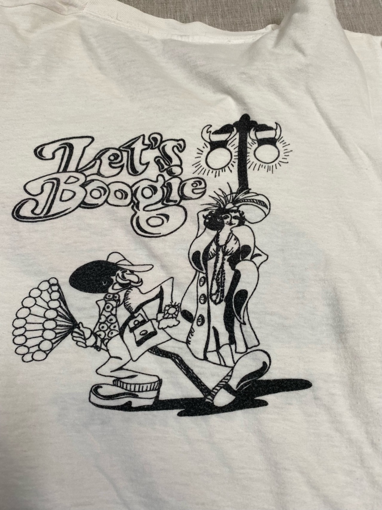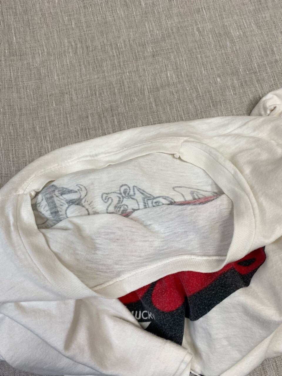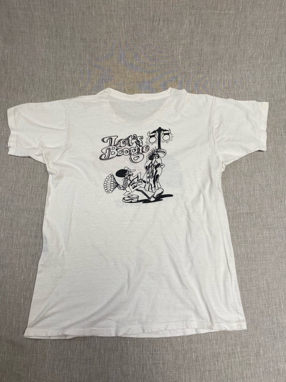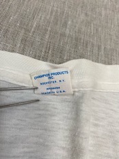 70年代のチャンピオンのTシャツです。恐らく70年代から80年代に流行った音楽ニューウェイブのTシャツだと思います。バッグプリントでは男性が女性を誘ってるプリントもかわいいです。この赤いチャンピオンネームも珍しいです。