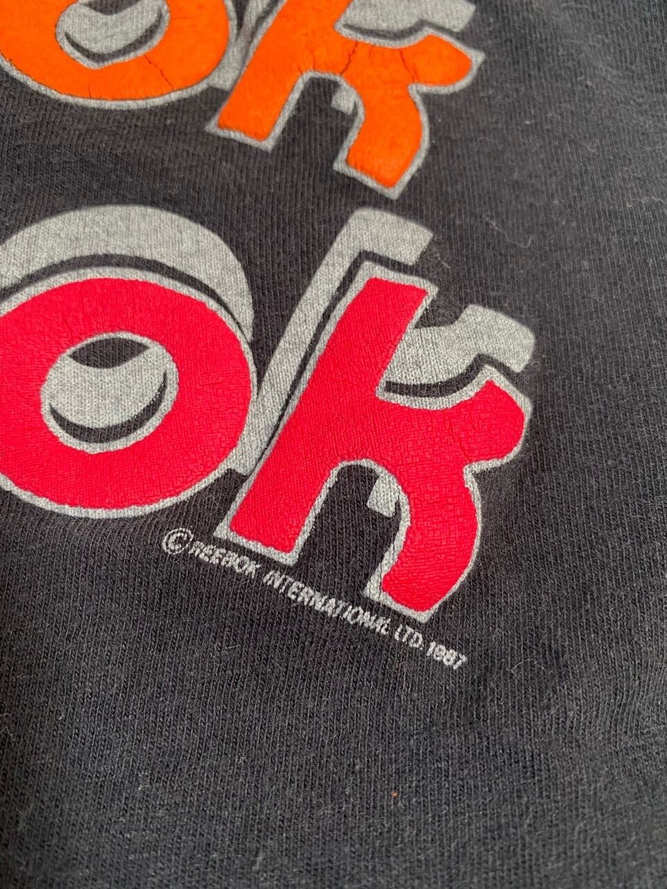 80年代のリーボックプリントTシャツです。黒なので古着独特な色褪せ感もありますが、プリントのデザインがとてもかわいいTシャツです。80年代らしい色合いもいい感じです。