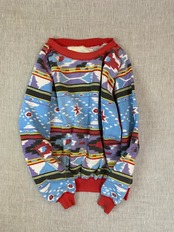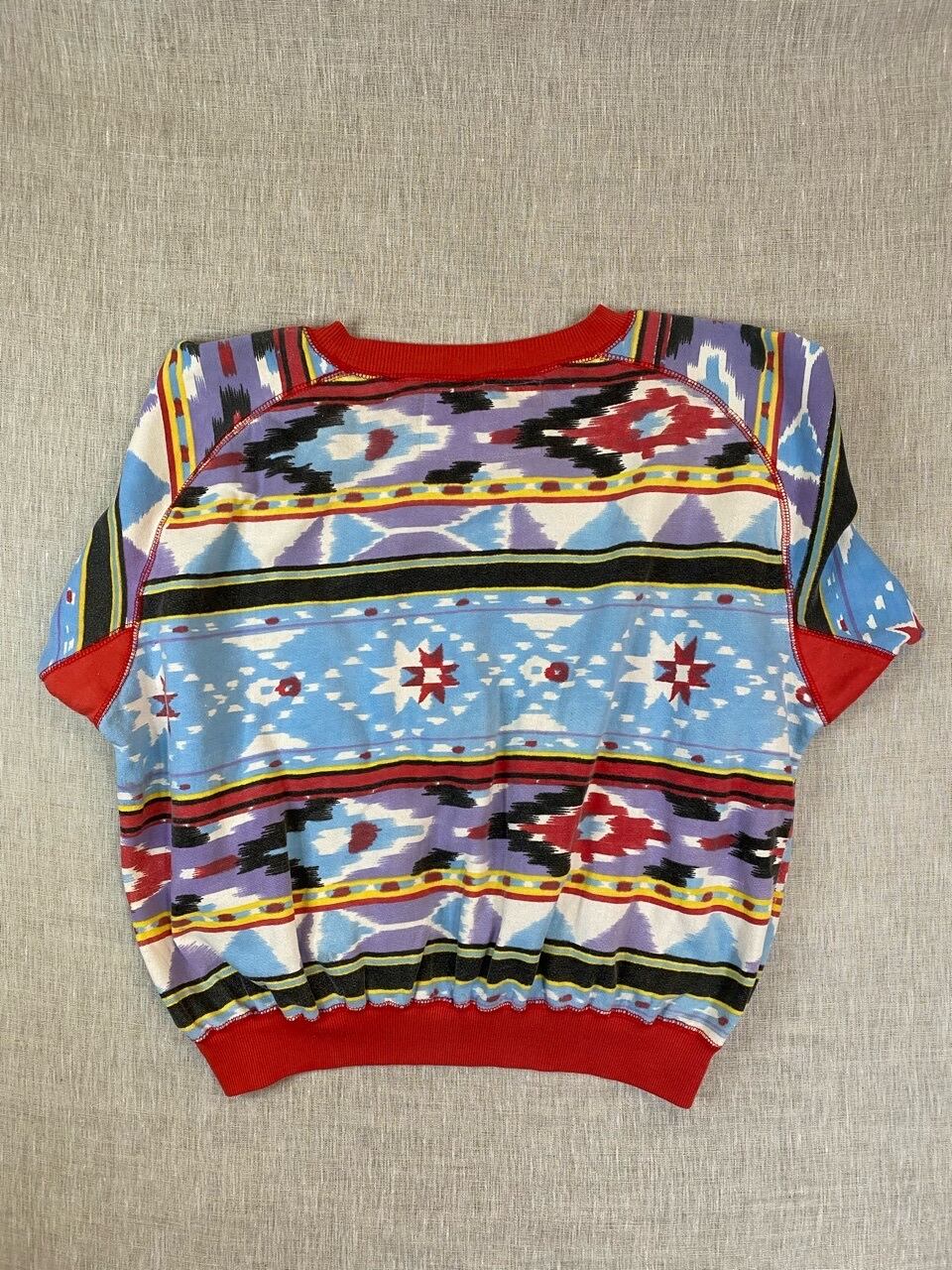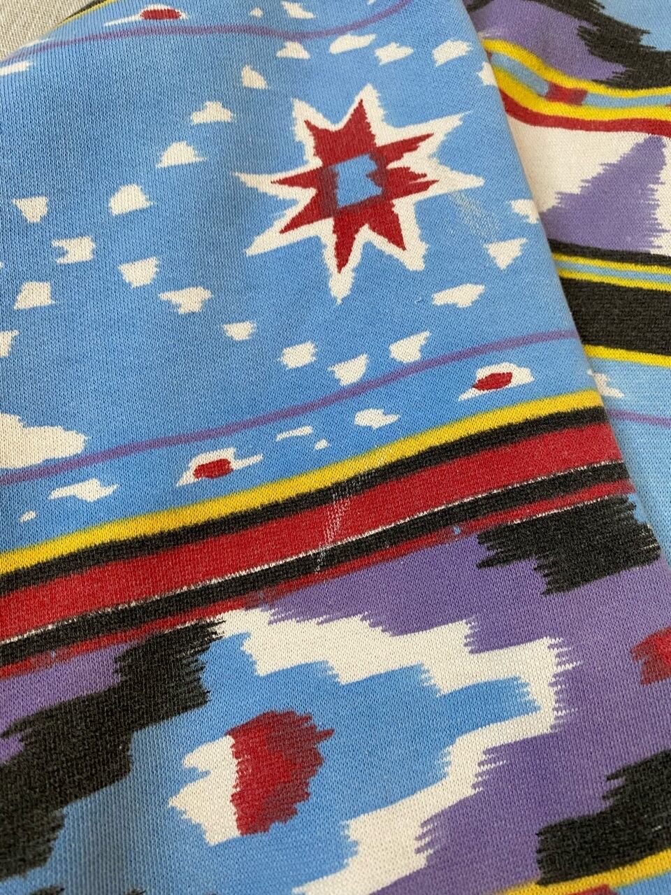 何も情報がありませんが、購入時期やデザイン的に恐らく80年代くらいのエスニック柄スウェットだと思います。独特な柄と色合いは雰囲気も良くて型もがわいいシルエットです。