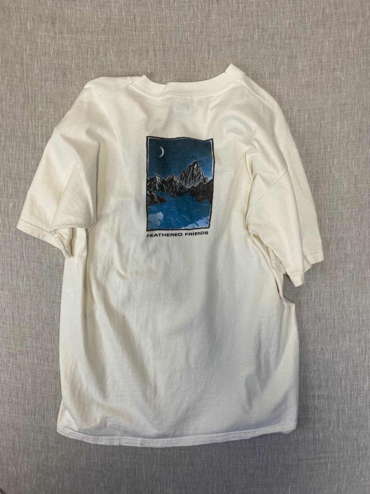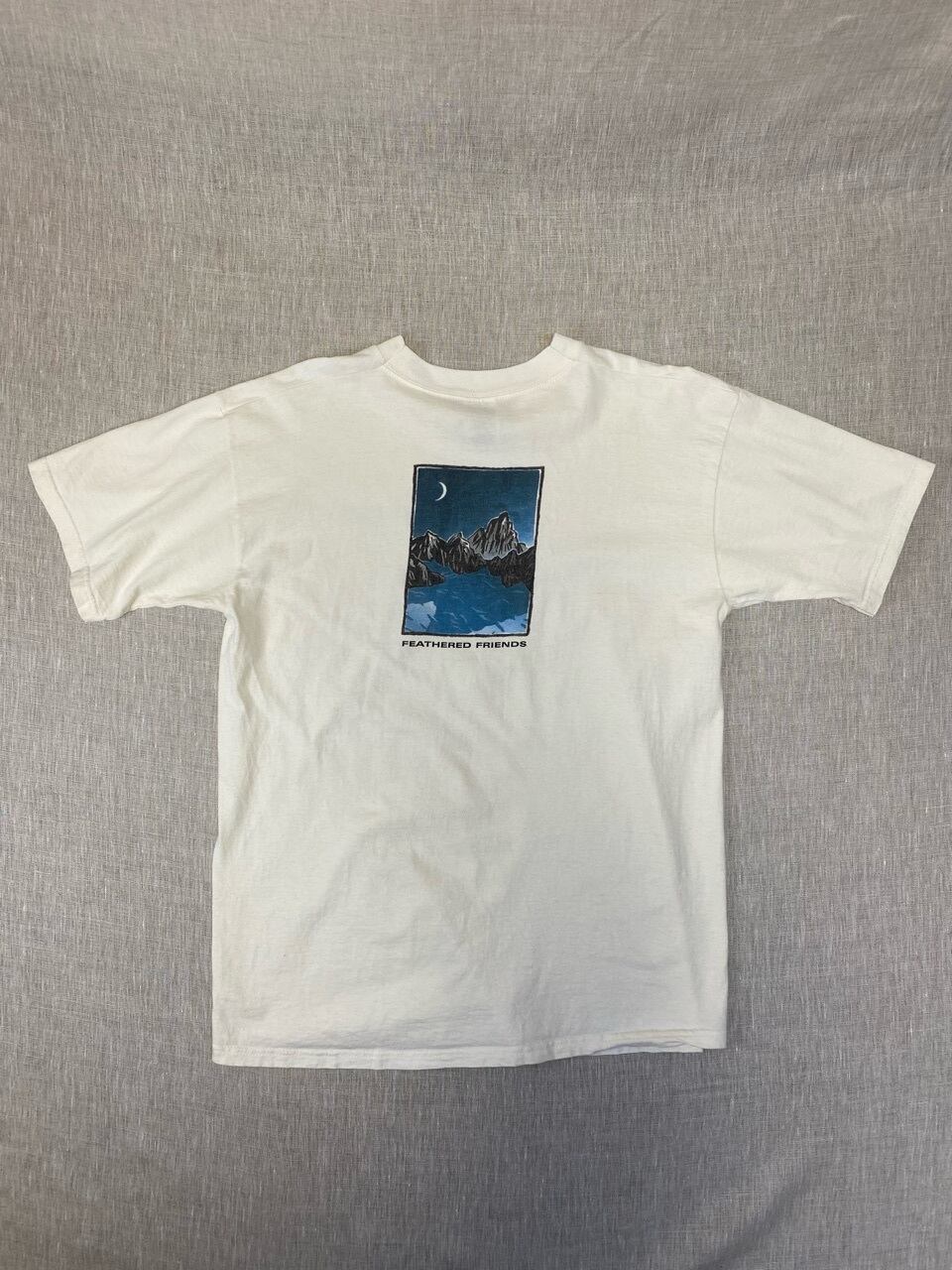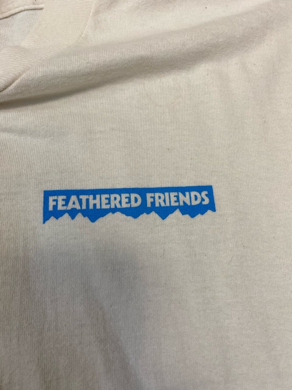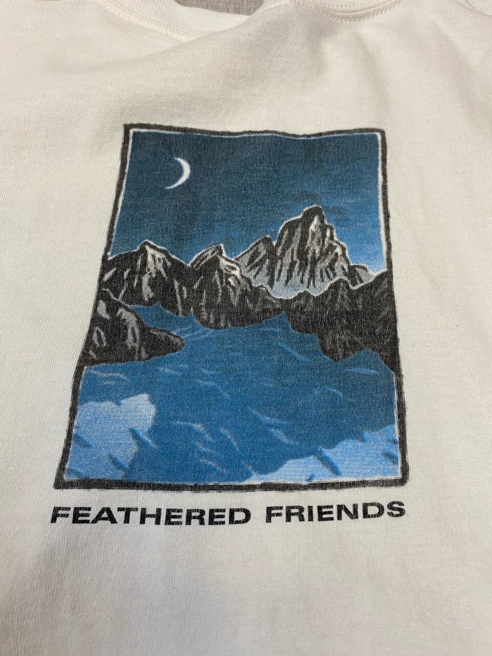 1972年シアトルで生まれたアウトドアブランドで寝袋やダウン製品が人気のフェザードフレンズのプリントTシャツです。90年代のアウトドアブランドには雰囲気のあるカッコいいプリントがたくさんありますが、この月の綺麗な夜の山もいいプリントです。