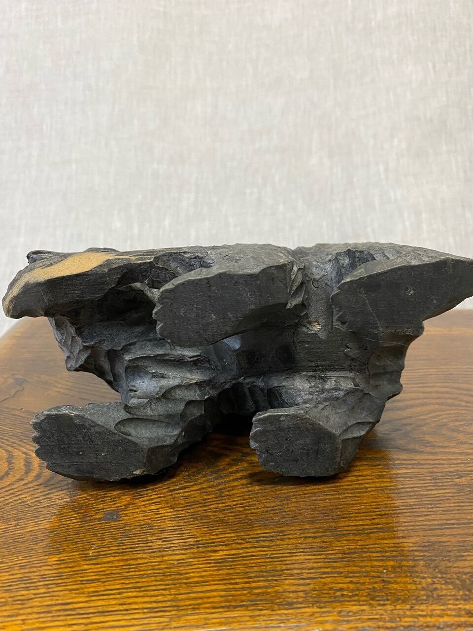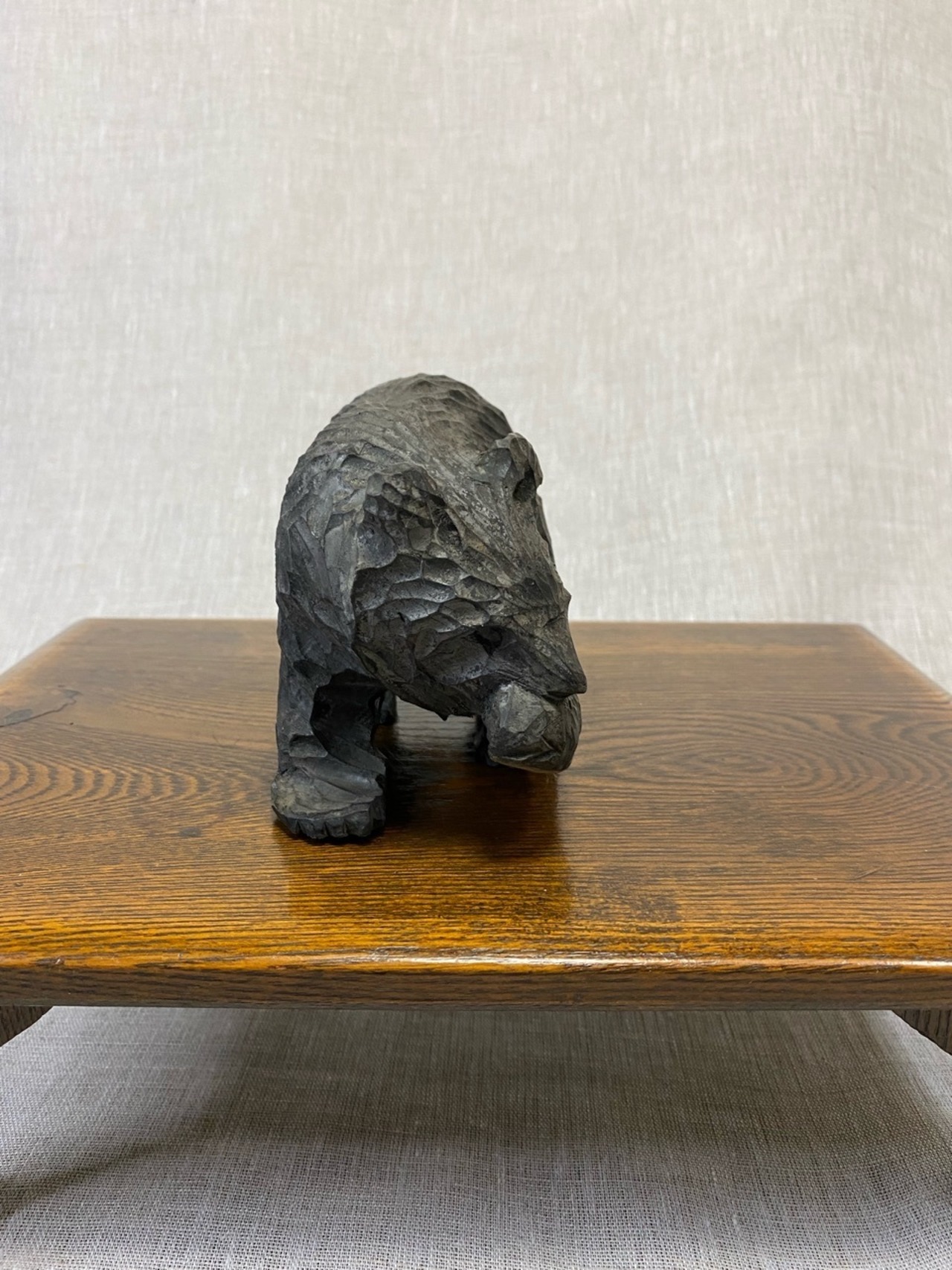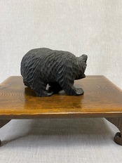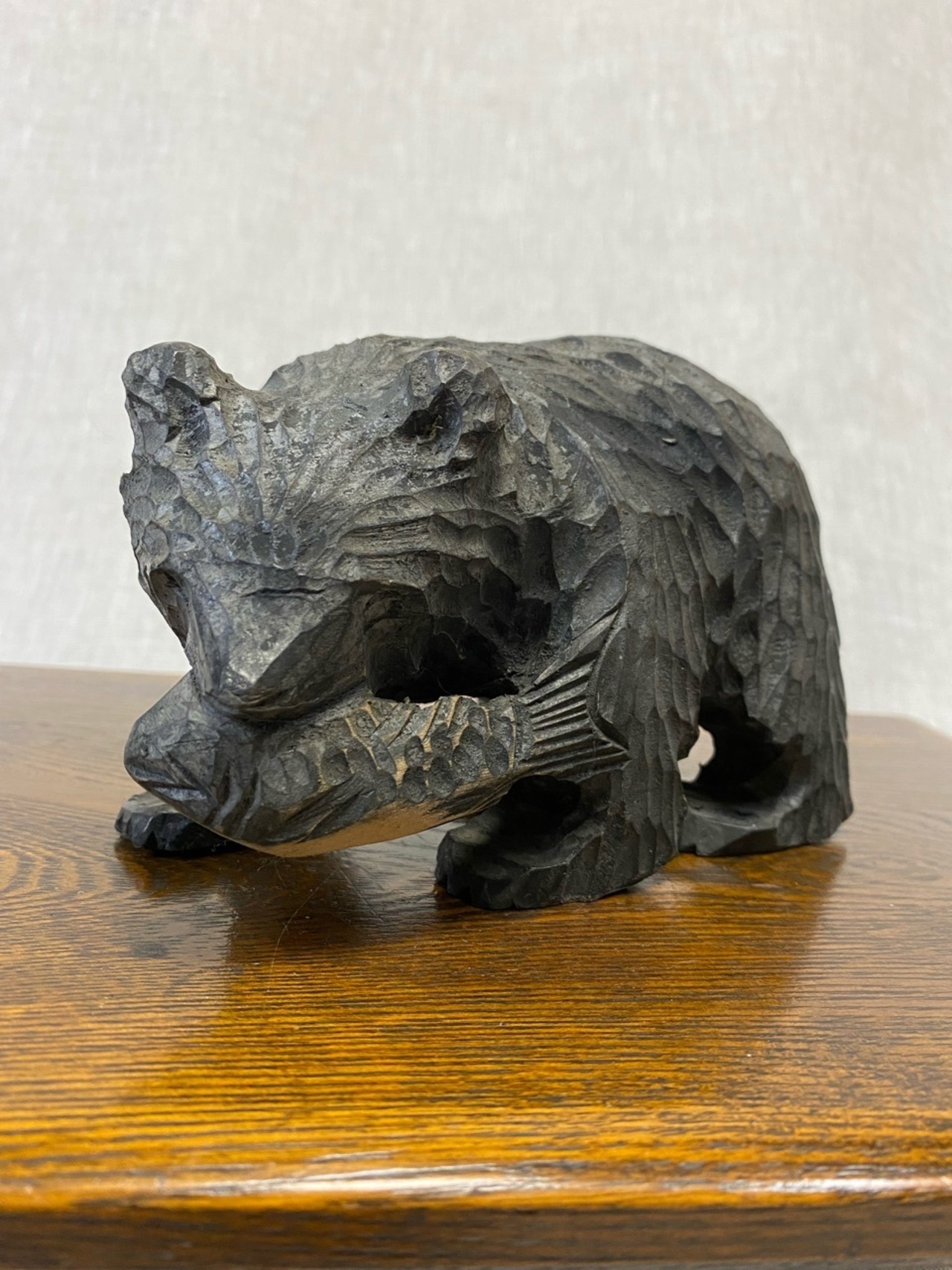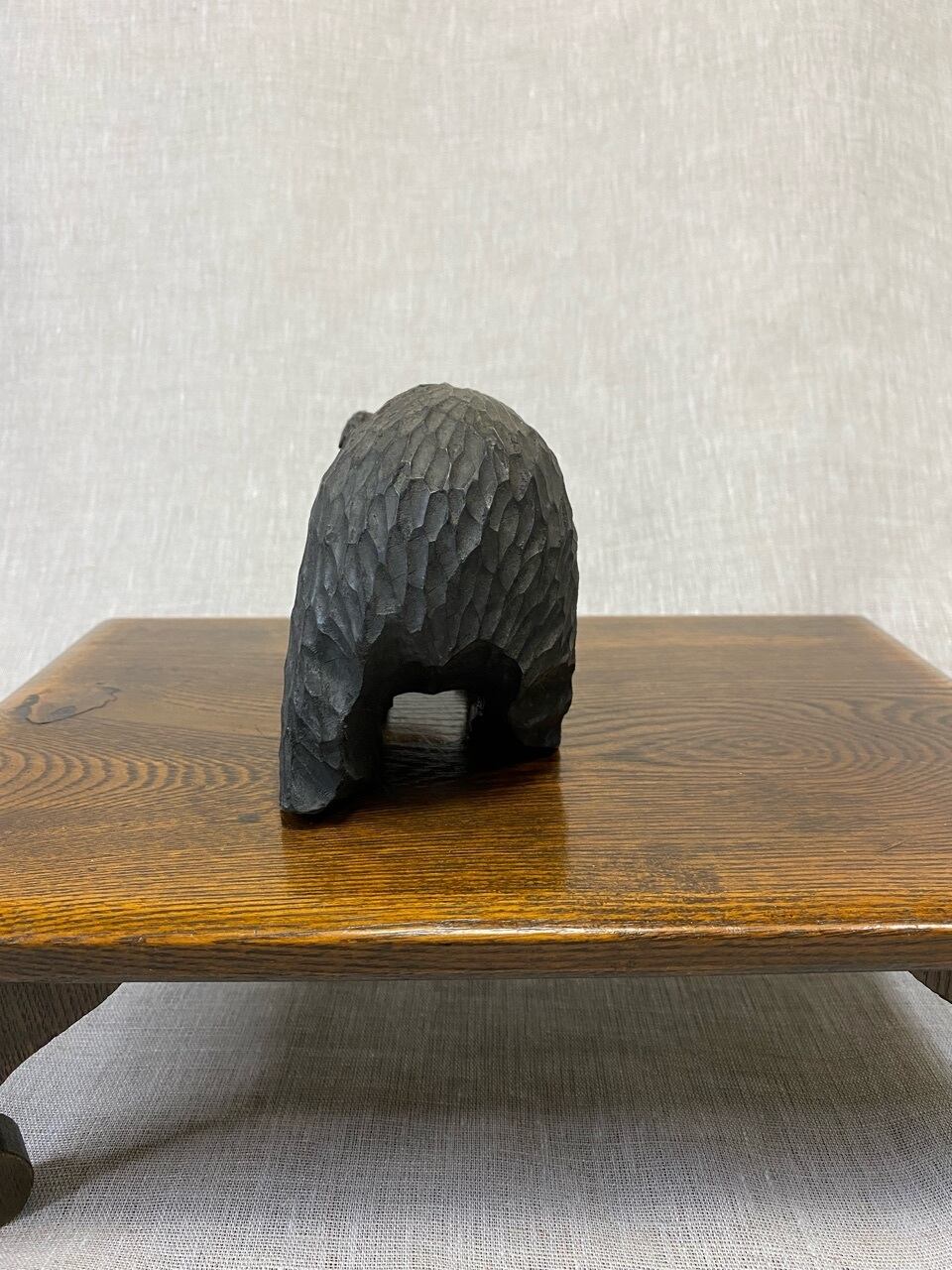 恐らく昭和の北海道お土産として販売されていた木製の熊の置き物です。少し小さめで顔も子熊のように感じます。小さな魚をくわえた定番のタイプです。なんとも言えないかわいい顔とシルエットです。