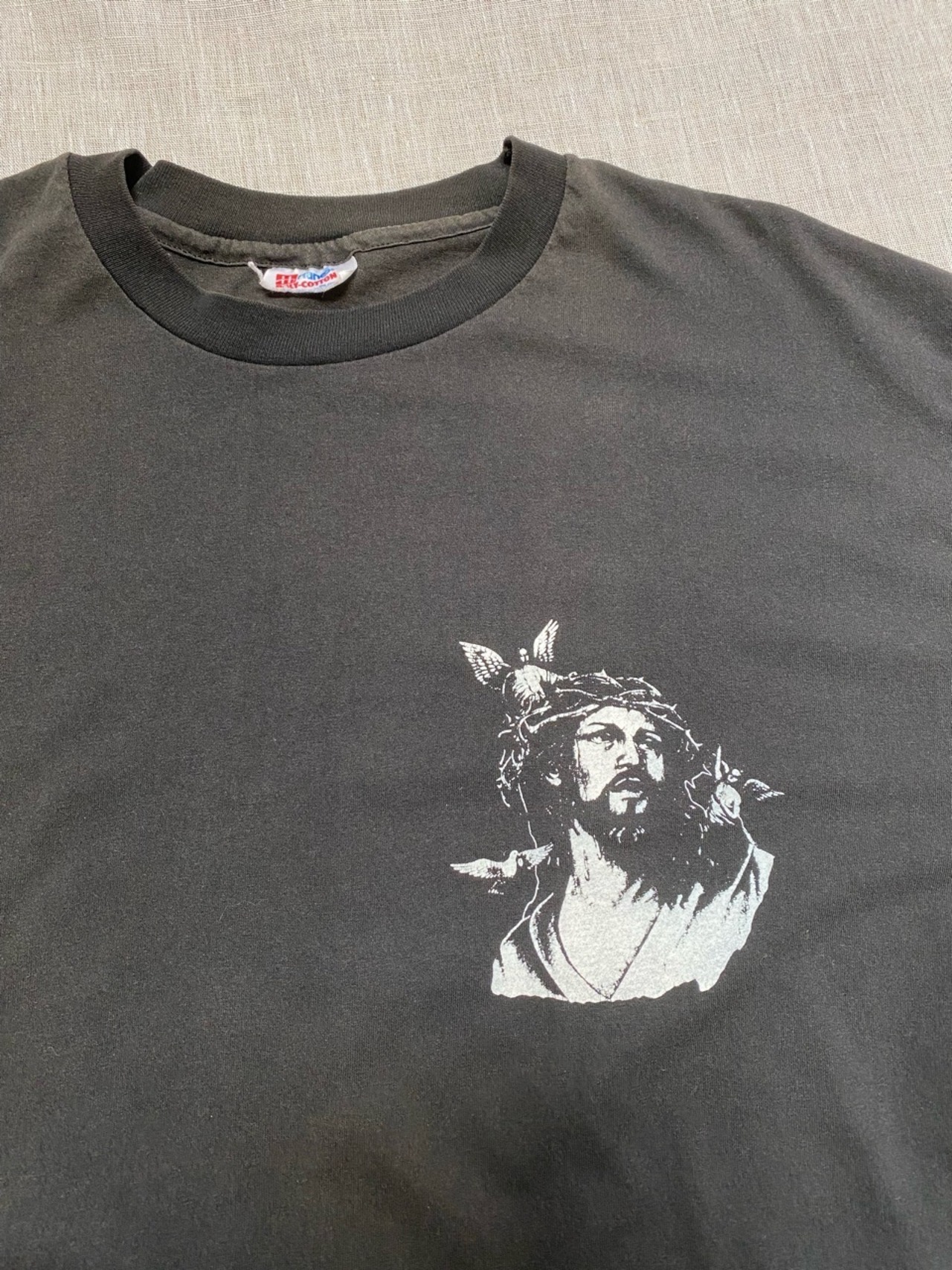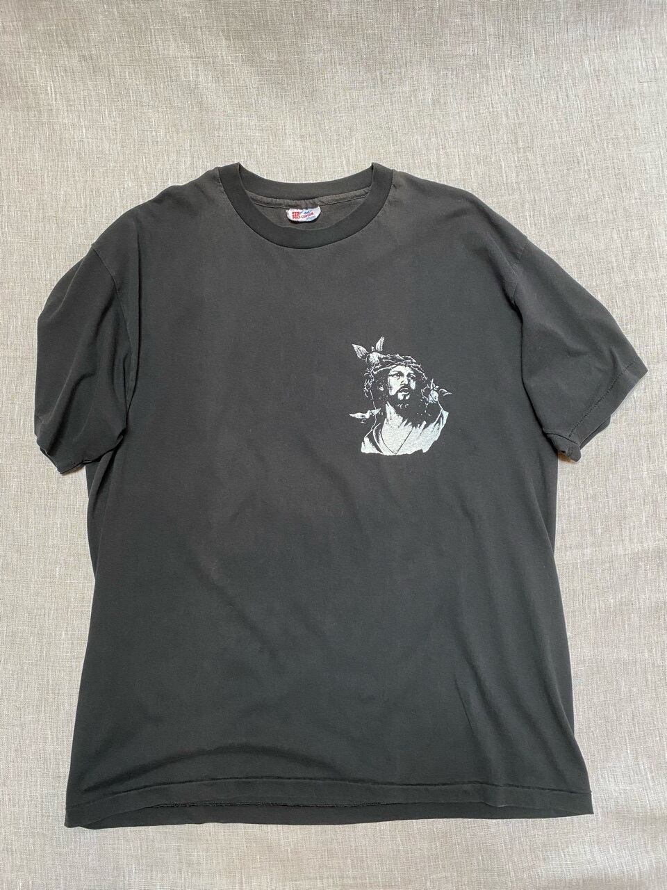 80年代〜と思われるヘインズボディを使用したイエスキリストのプリントがインパクトあるTシャツです。フロントには胸、バックは背中一面のプリントです。ありそうでないモノだと思います。