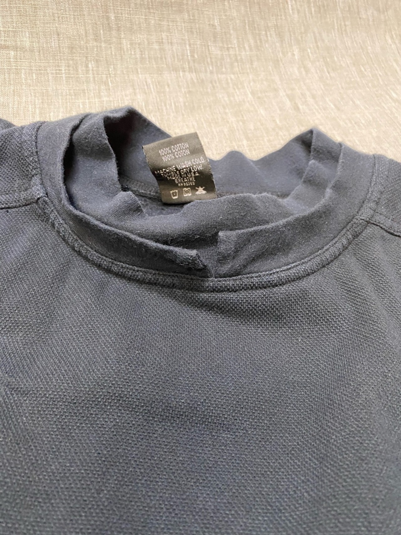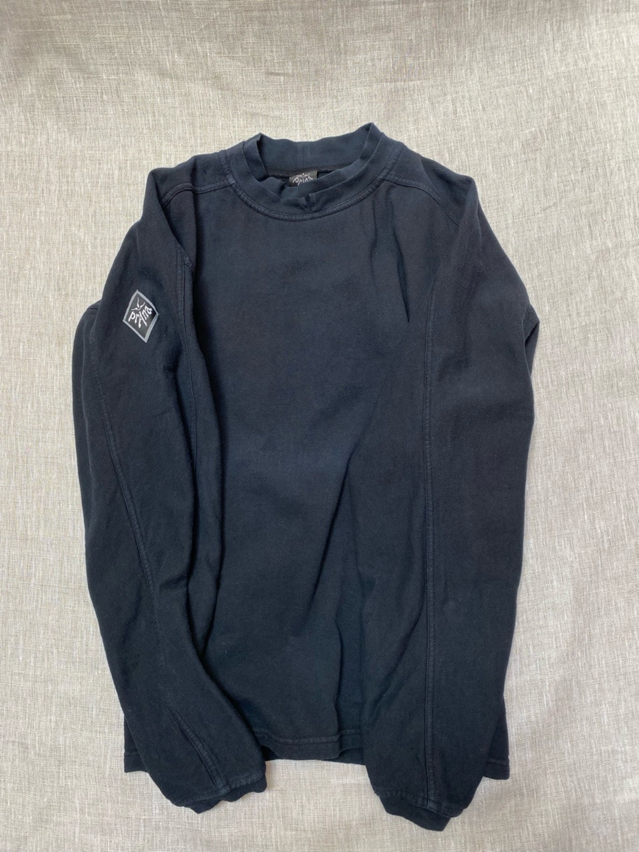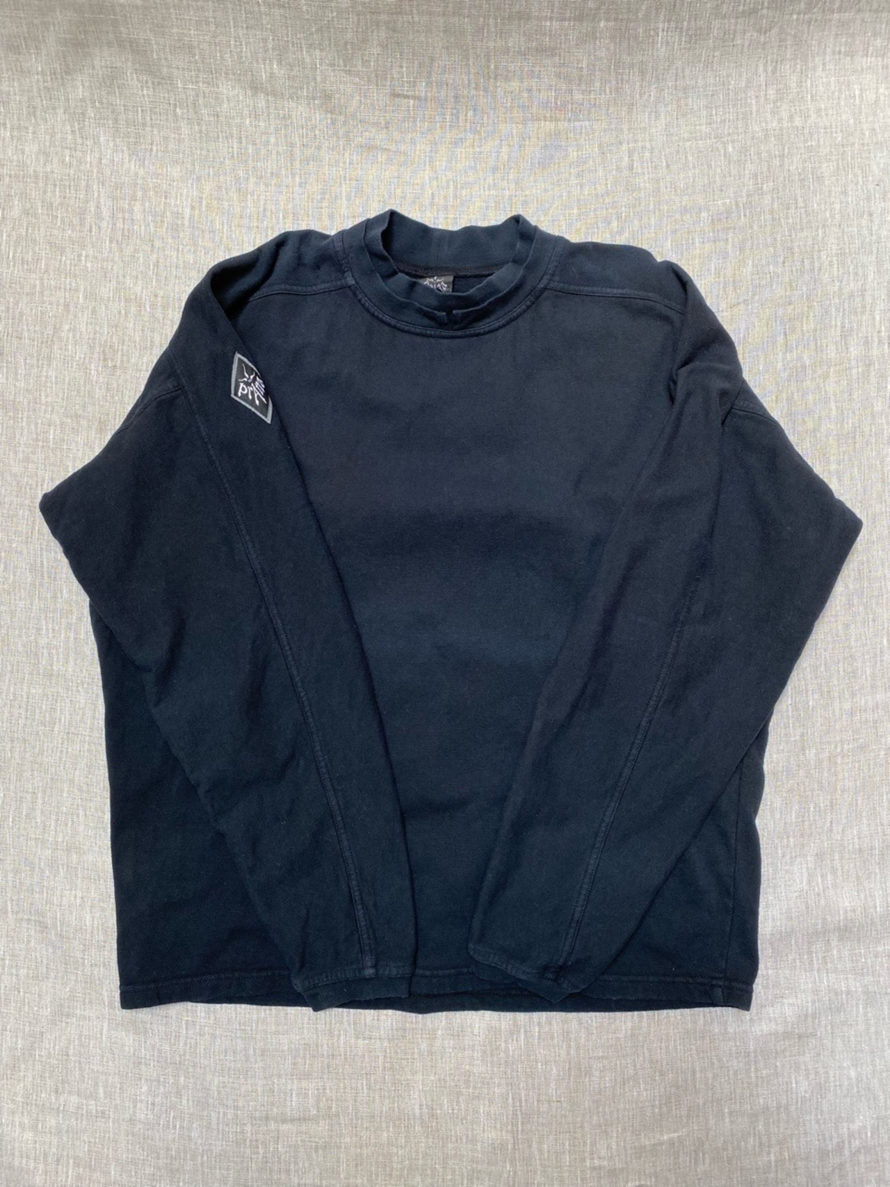 アメリカカリフォルニアにあるクライミングブランドのプラナの90年代のスウェットです。表はカノコで裏は起毛での珍しい生地で、首元が2重で肩から袖の縫製も独特な90年代アウトドアブランドらしいデザインです。黒で古着独特な色褪せた感じや日焼けもあります。