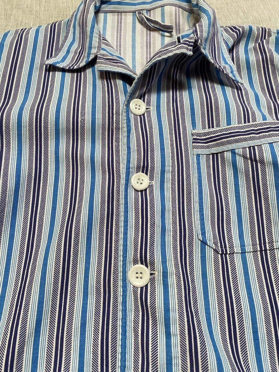 年代やブランドなどは不明ですが、ボタンや生地などから古いヨーロッパのミリタリーかなにかのパジャマシャツだと思われます。サイズ小さめなので女性の方などがジャケットの様にサラッと羽織っていただきたいです。