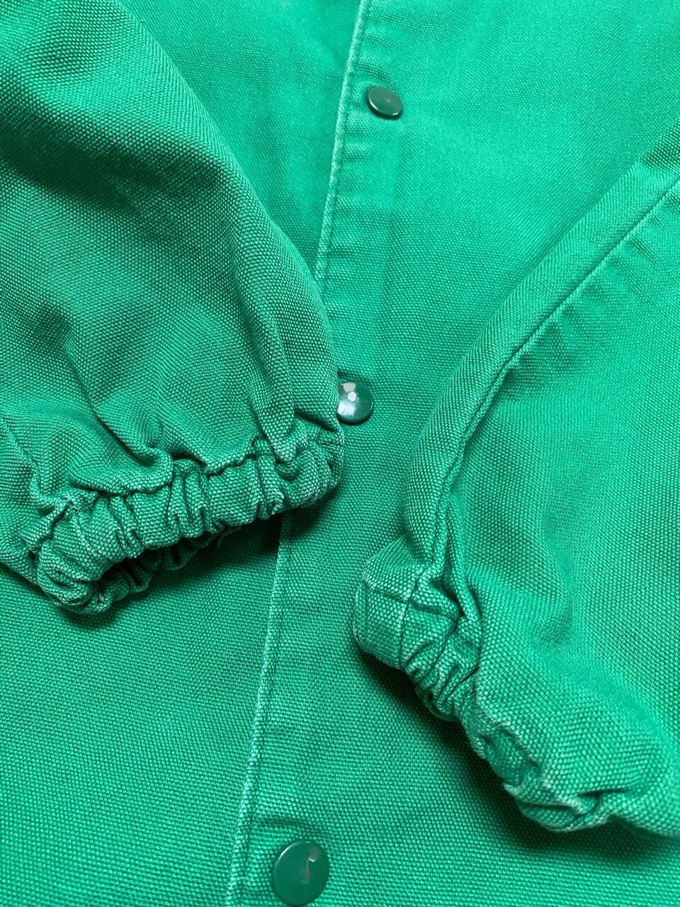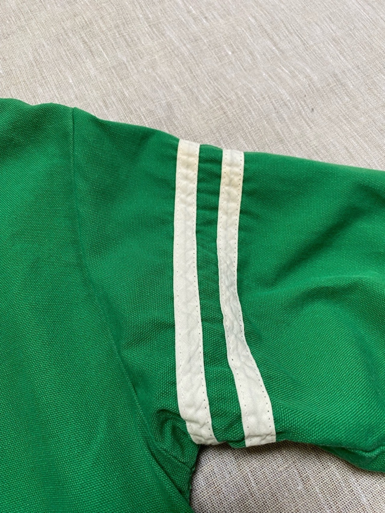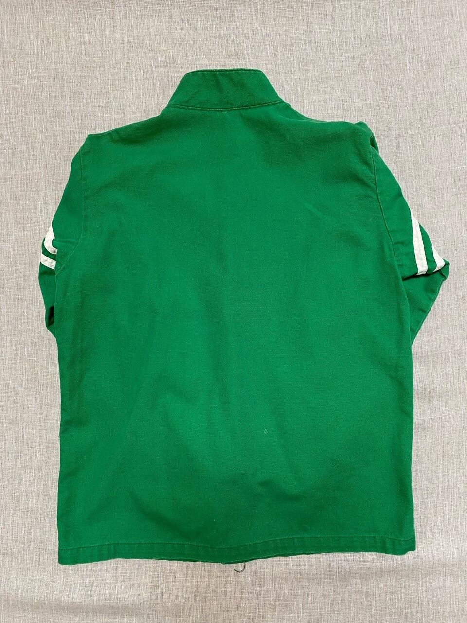 70年代と思われるスタンド襟のライン入りスポーツジャケットです。この辺柔らかいコットンツイル素材でボタンは70年代のスコービル社を使用しています。サイズは女性向けのサイズです。