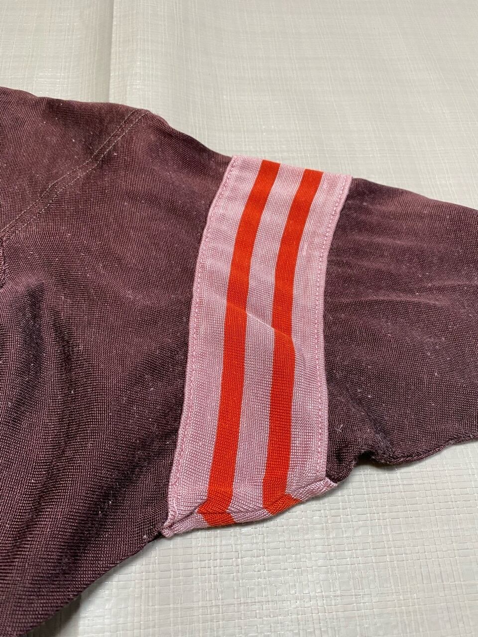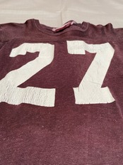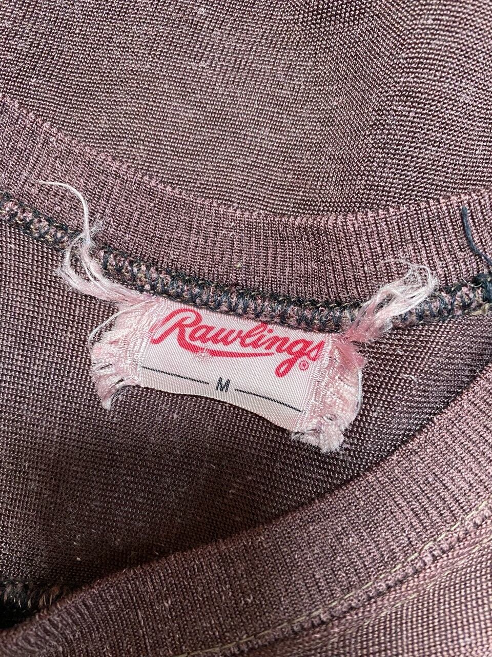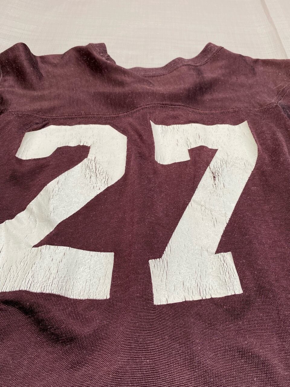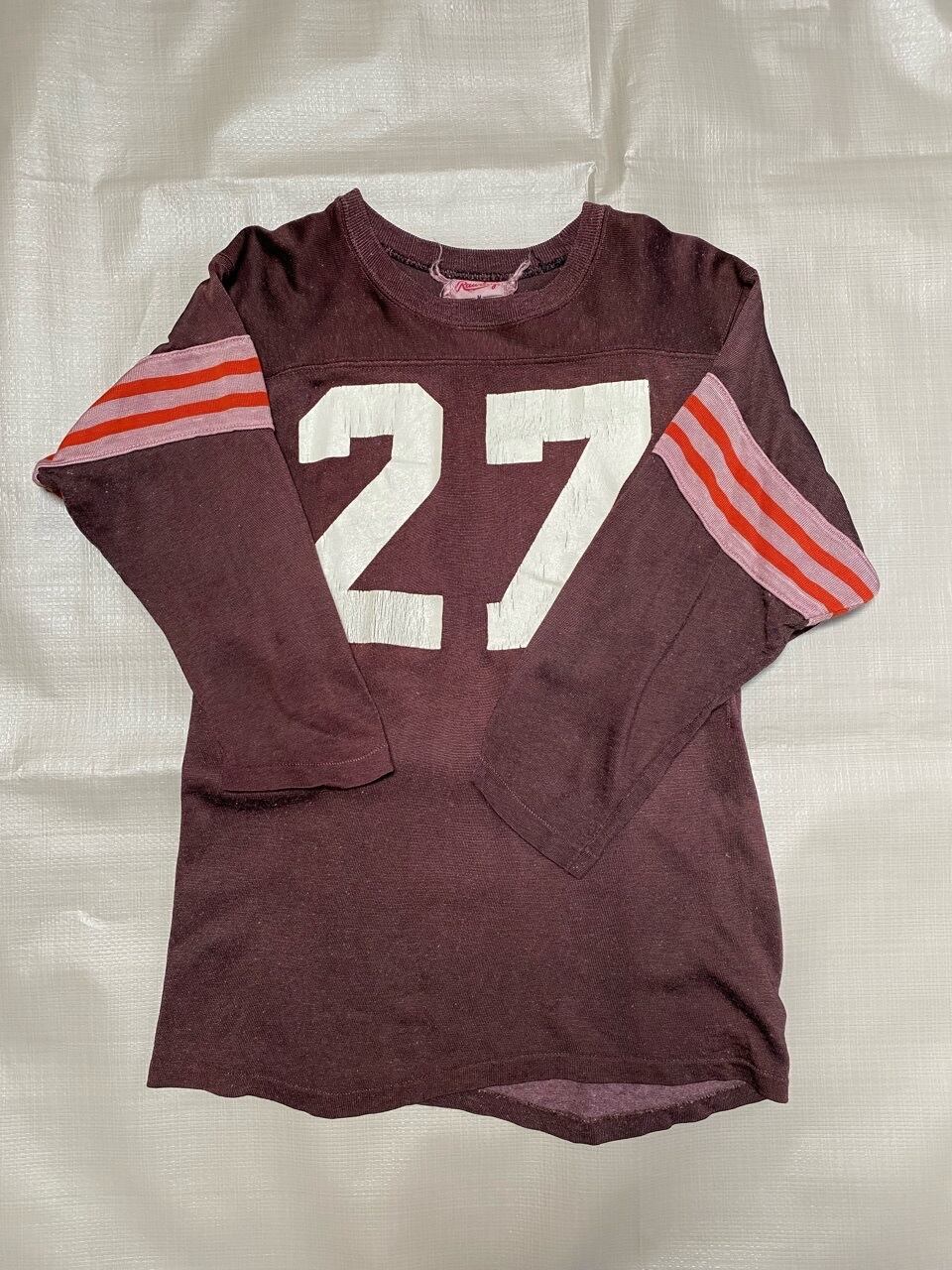 70年代と思われるレーヨン混フットボールTシャツです。サイズは女性向けです。色も褪せ形もよれていて脇も縫い直しもあり大事に長く愛用されていたモノだと思われます。プリントも割れ味の出たフットボールシャツです。