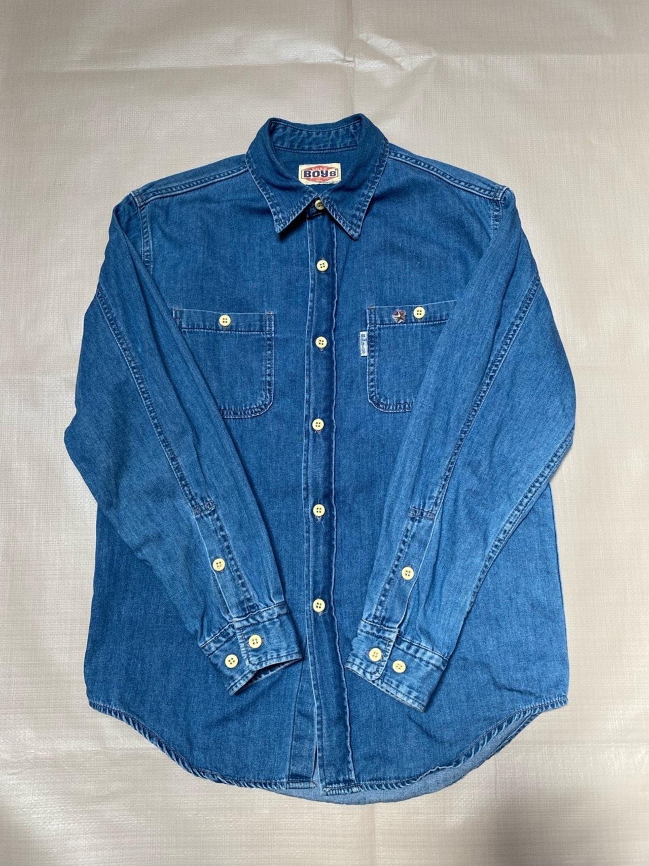 90年代のハリウッドランチマーケットオリジナルブランドBLUE BLUEのダンガリーシャツです。Boy'sというレディースシリーズのワークシャツです。左胸のポケットに星のスタッズが後付けされてます。元々ユーズド加工してるモノになります。レディース向けのワークシャツは以外に少ないと思います。