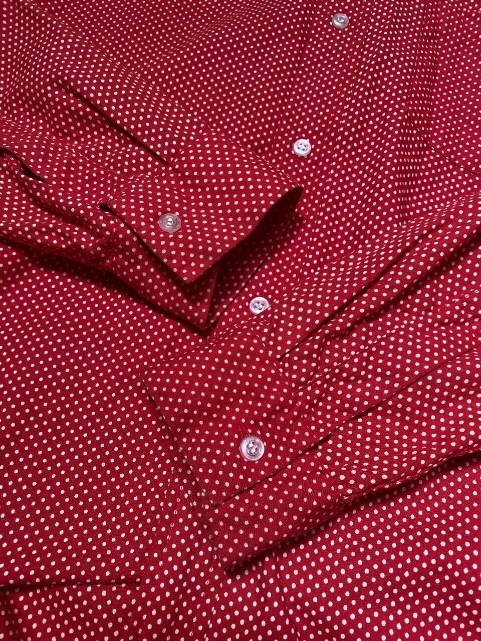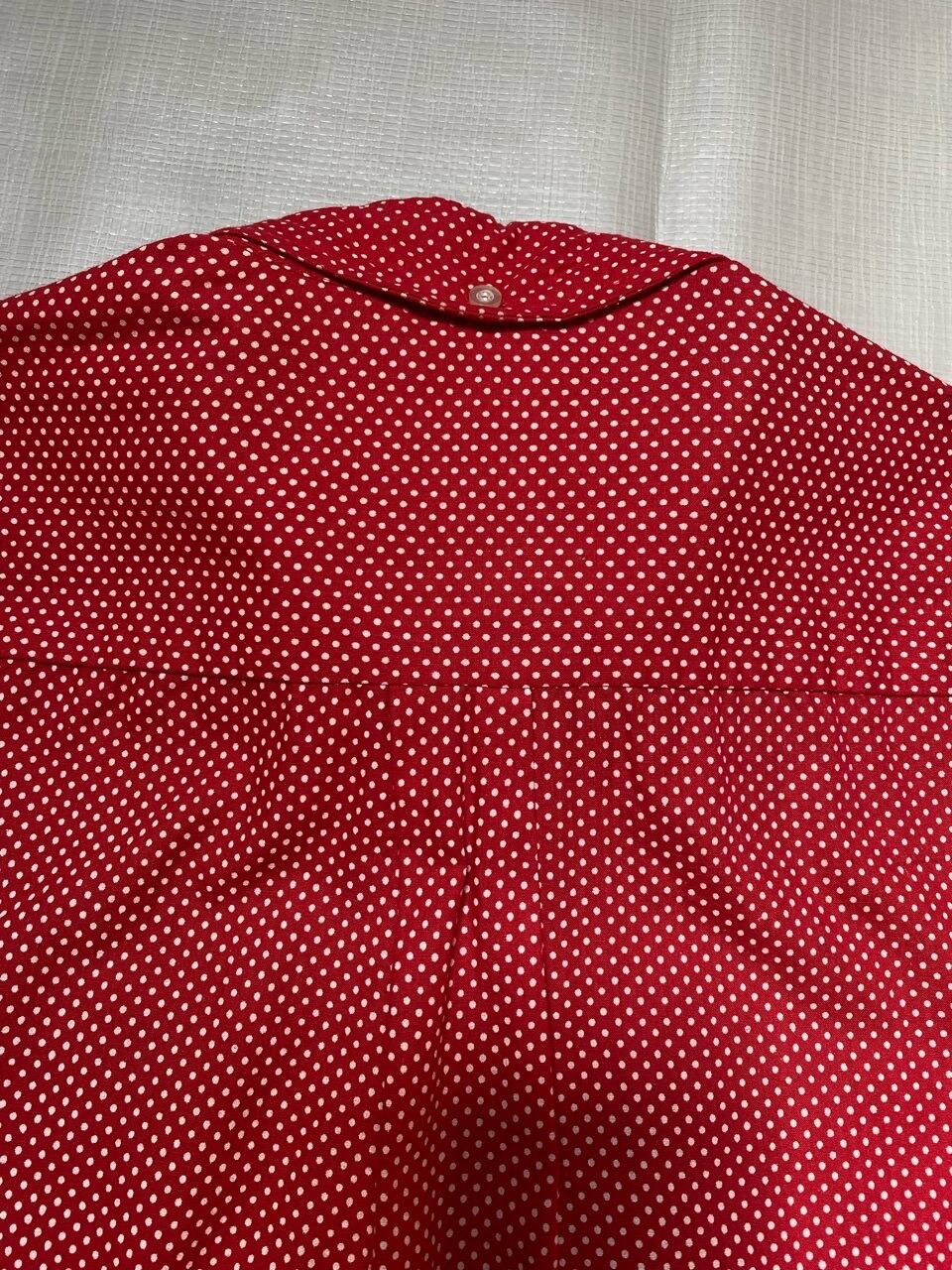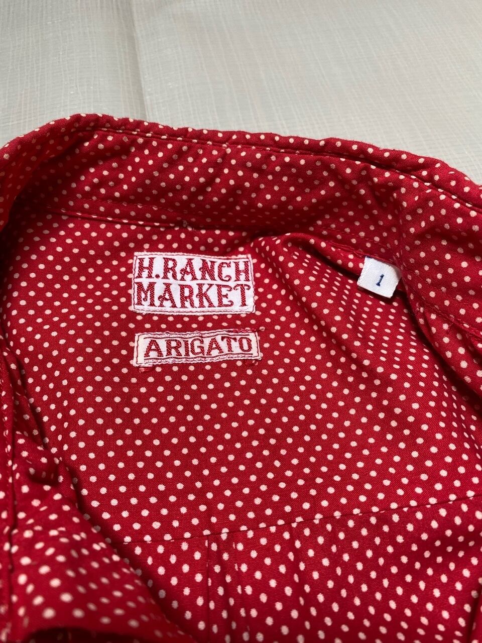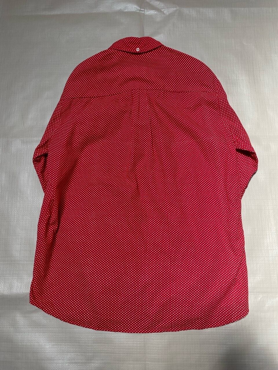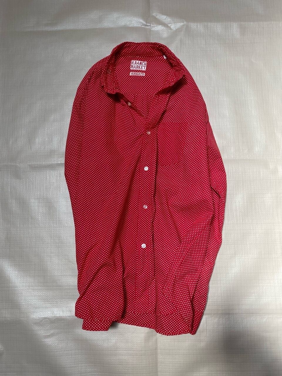 90年代のハリウッドランチマーケットオリジナルのドットシャツです。細かなドット生地はインド製の清涼感のある生地です。カフスも短めです。写真にありますが襟の内側に蝶ネクタイ用のスナップボタンがありますが、蝶ネクタイは付いていません。サイズ的に女性の方にオススメです。