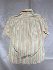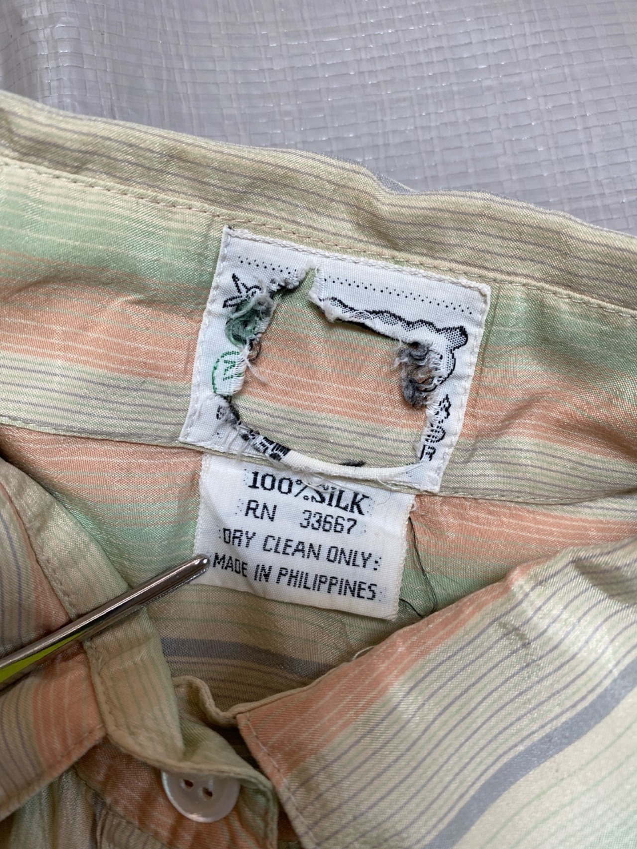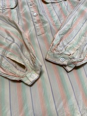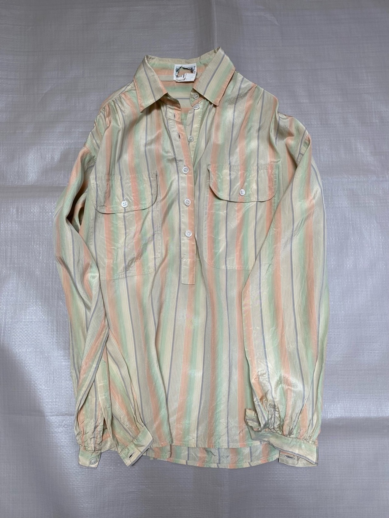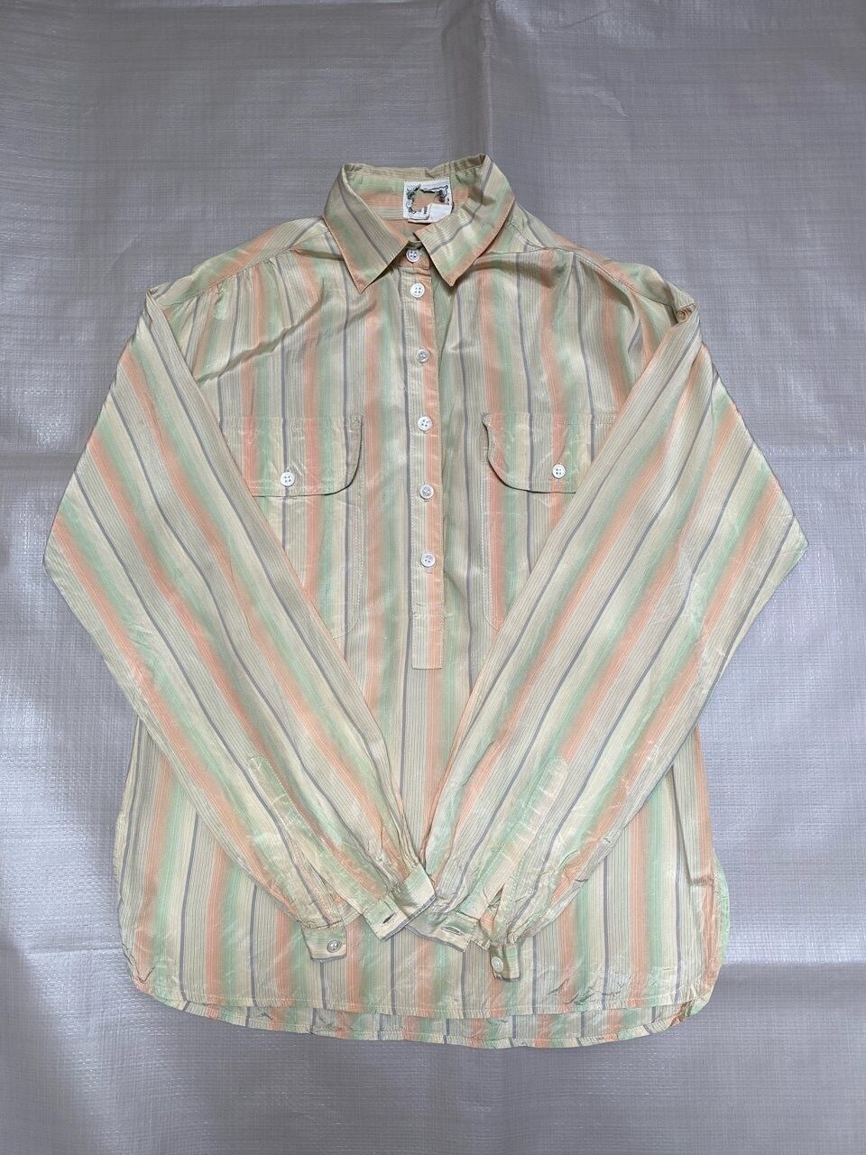 ブランドや年代などは不明てすが、80年代以前でRNナンバーがあるのでアメリカ企業のシャツと思われます。シルク素材のプルオーバータイプのマルチストライプのブラウスです。シルク生地のなので光沢のあるサラッと着れる肌触りの良いシャツです。
