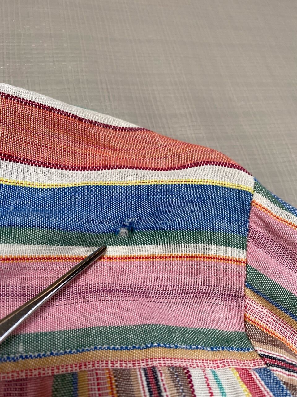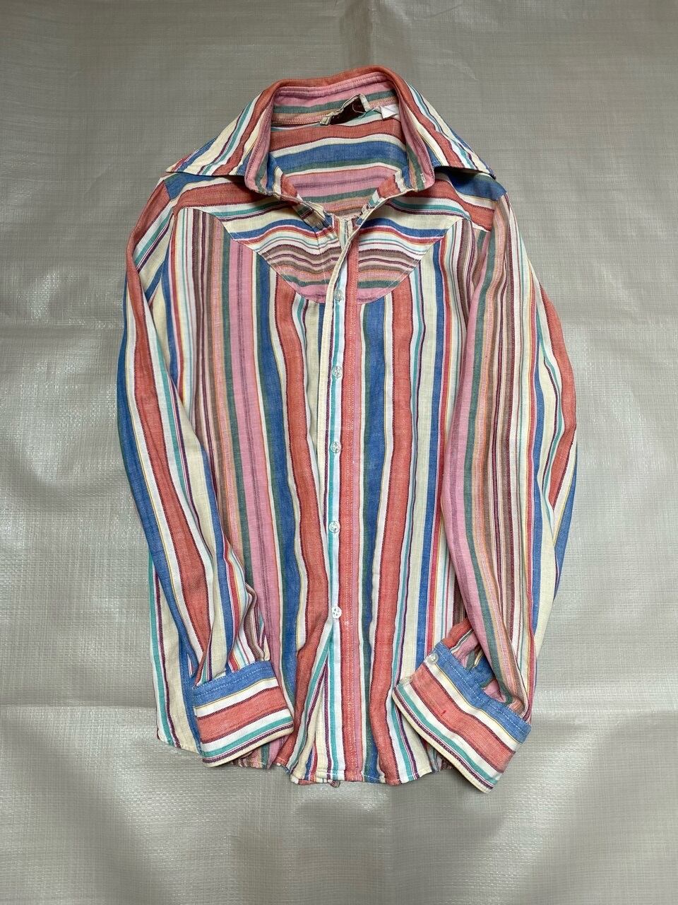 70年代のSHIRTWORKS SANFRANCISCOの70年代らしいマルチストライプのウエスタンシャツです。衿芯の入った大きな襟も独特で雰囲気抜群だと思います。