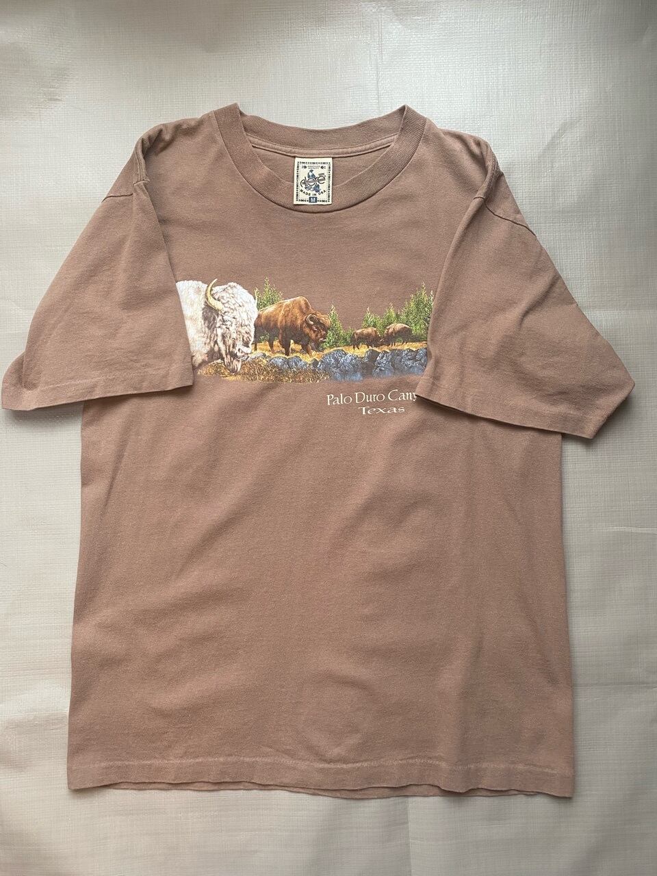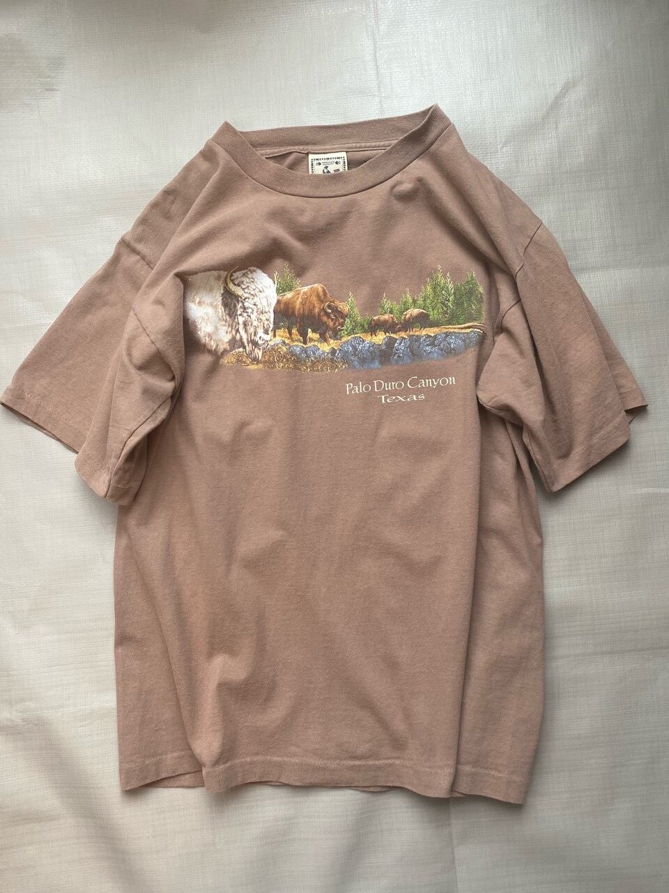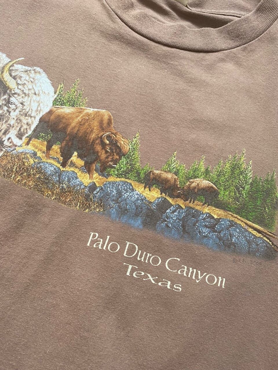 00年のパロ・デュロ・キャニオン州立公園のスーベニアTシャツです。作者は不明ですが独特なバッファローとテキサスのグランドキャニオンといられる公園の絵です。薄いブラウンがいい感じです。