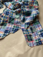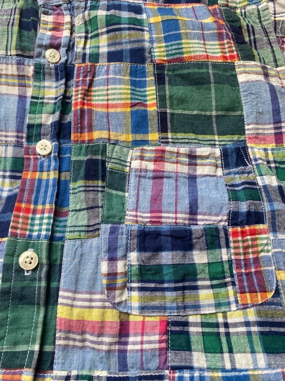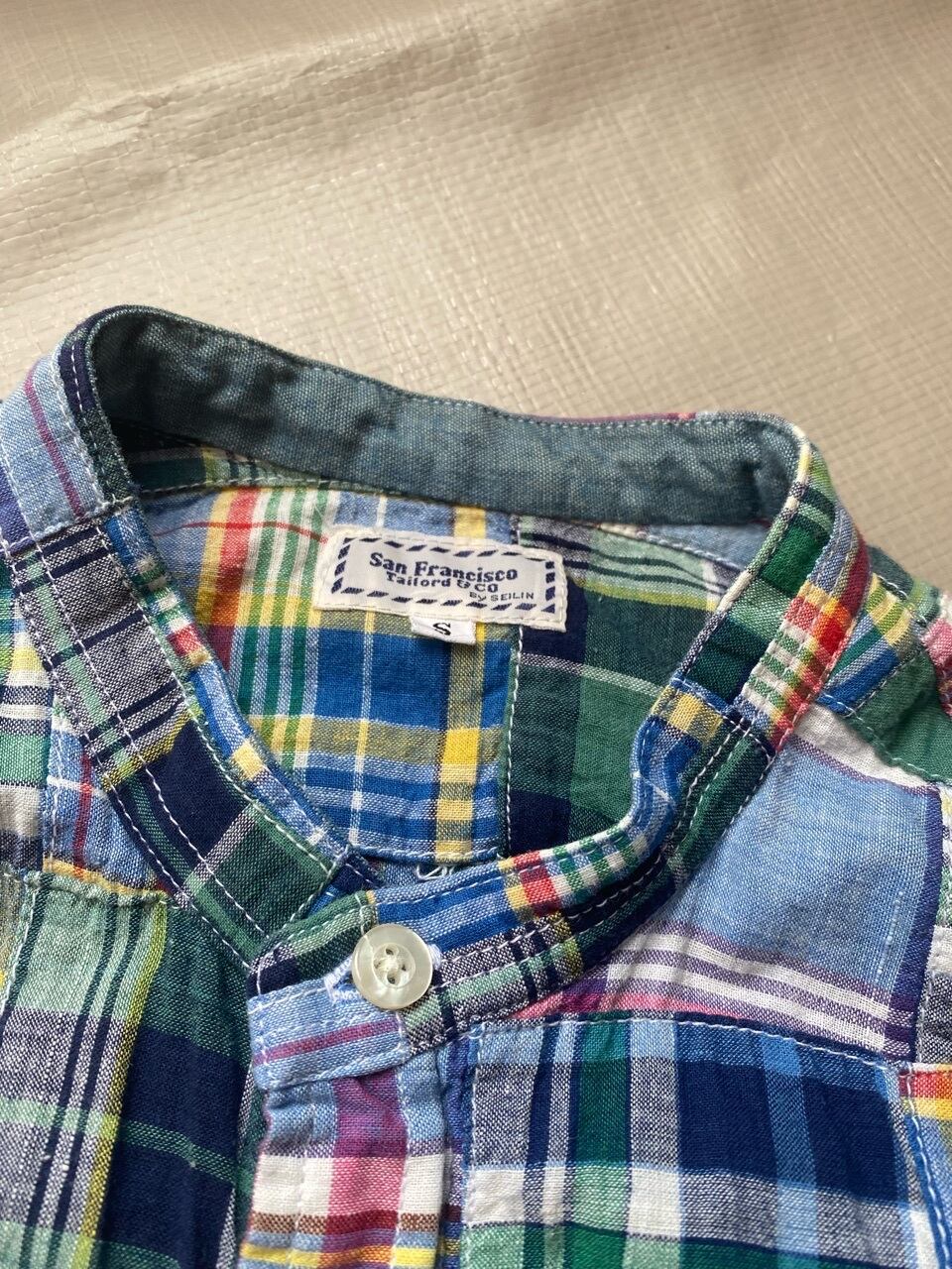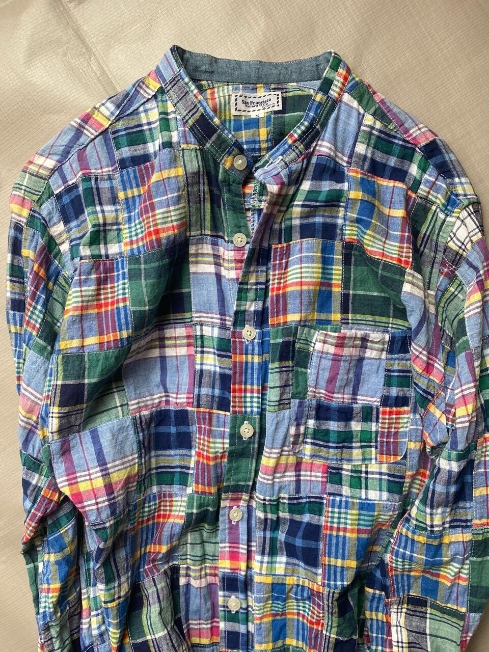 90年代と思われる日本の聖林公司オリジナルブランドサンフランシスコのマドラスチェックパッチワークシャツです。スタンドカラーでスッキリと着ていただけると思います。襟とカフス裏はシャンブレー生地になってます。