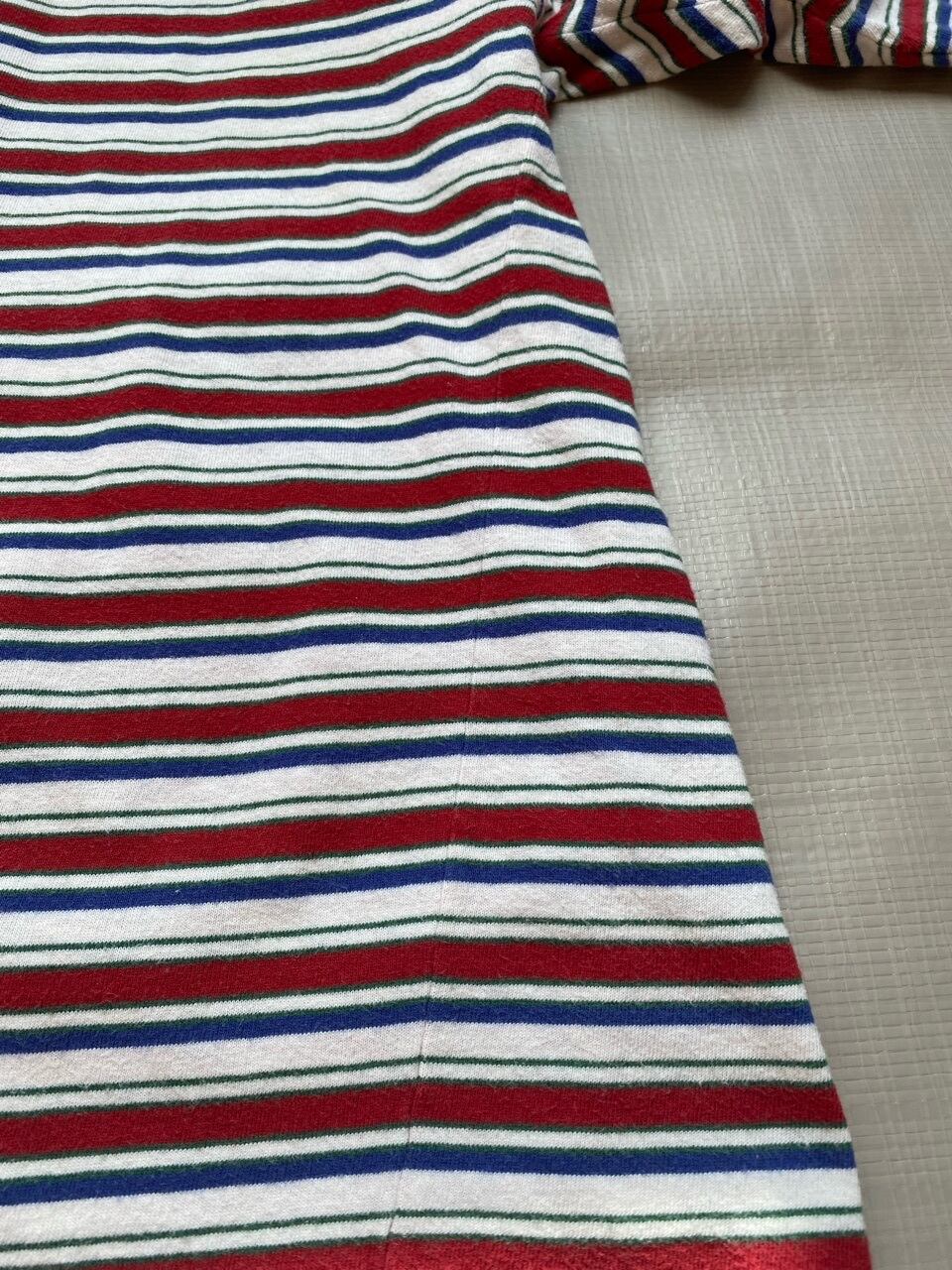 珍しい90年代のGAPWAREHOUSEマルチボーダーTシャツです。当時日本に直営店は無くインポートとして輸入していた頃のモノですが、特にウェアハウスネームは少ないと思います。綿素材の古着特有のよじれ感も出ています。90年代のモノで使用感や多少の汚れなどありますが是非。
