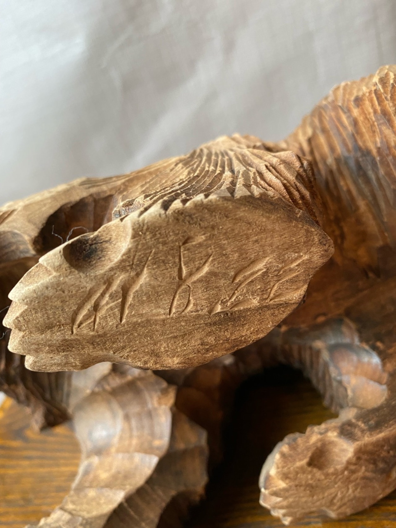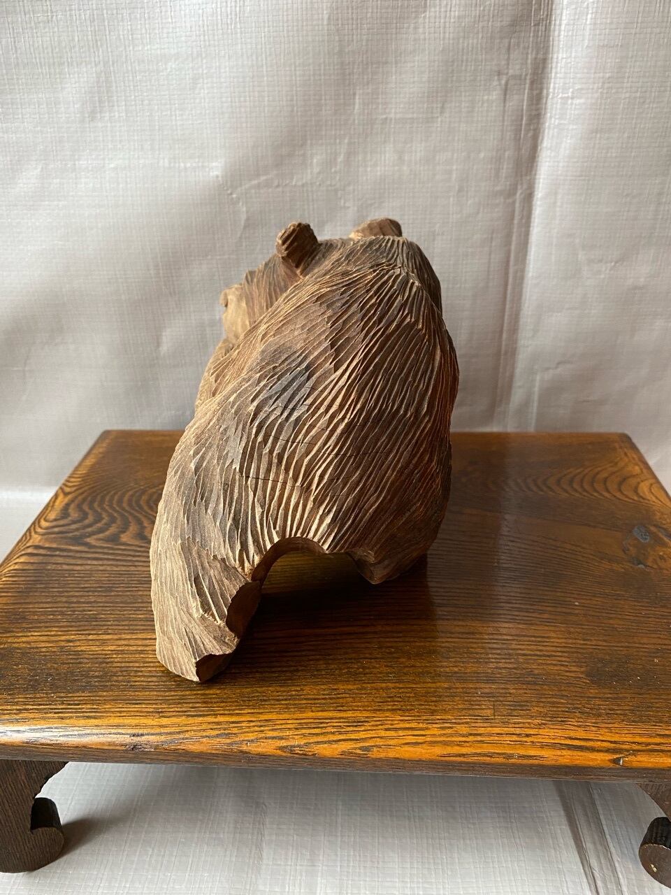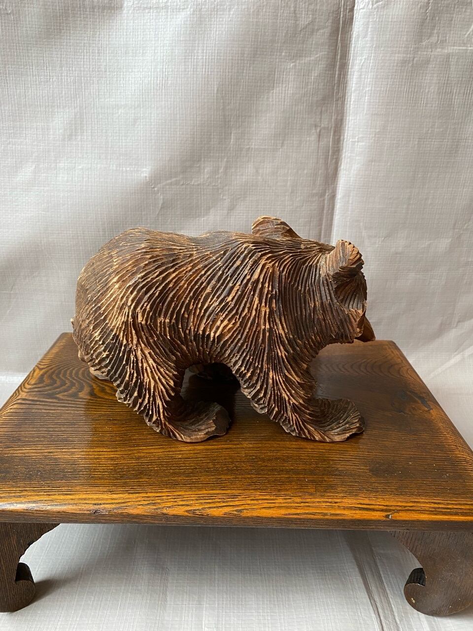 恐らく昭和の北海道お土産として販売されてた木製の熊の置き物です。少し大きめの大人の顔の熊で魚をくわえた定番のデザインです。まだ黒ずんでなく綺麗な状態だと思います。足裏にサインの様なものがあります。
