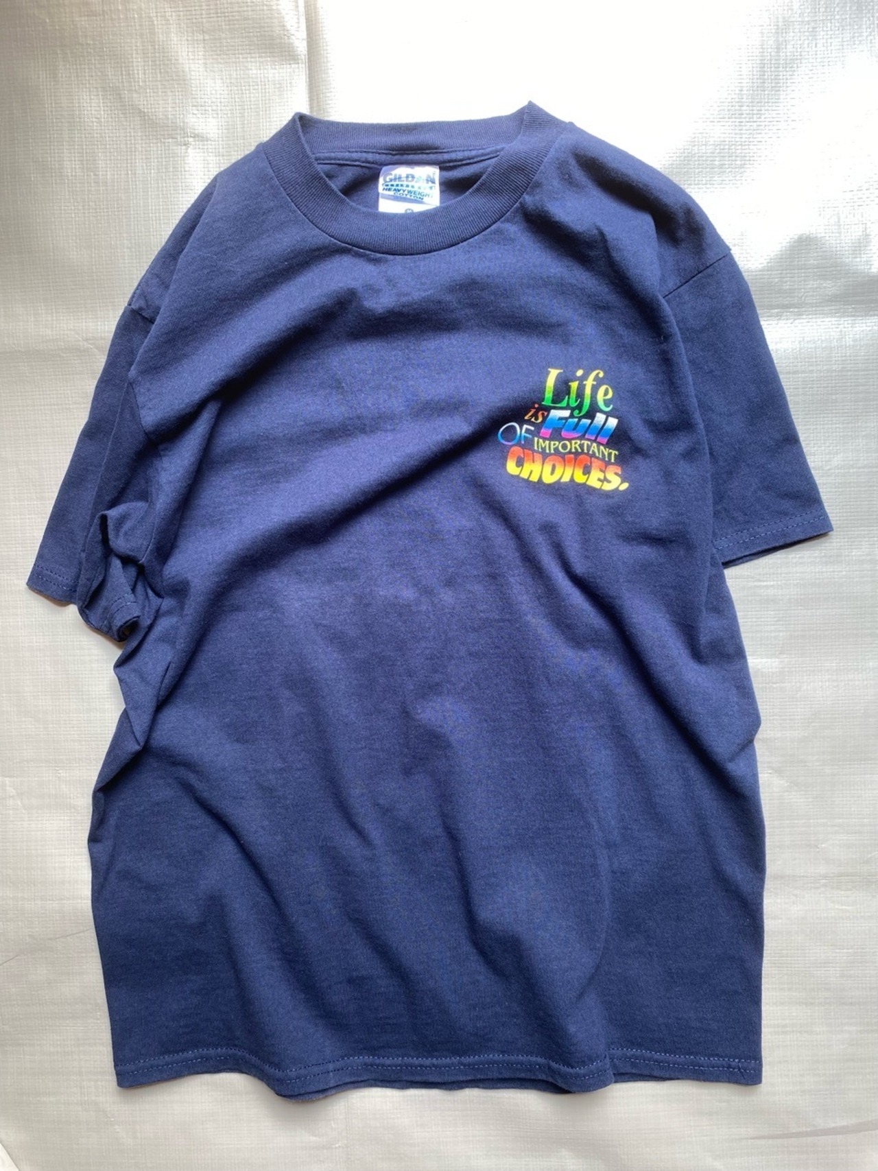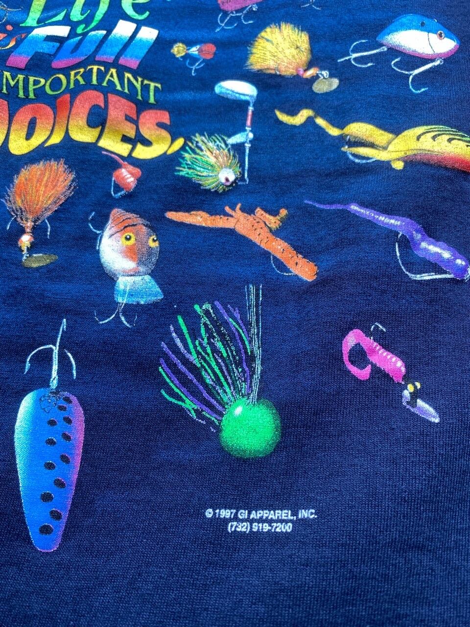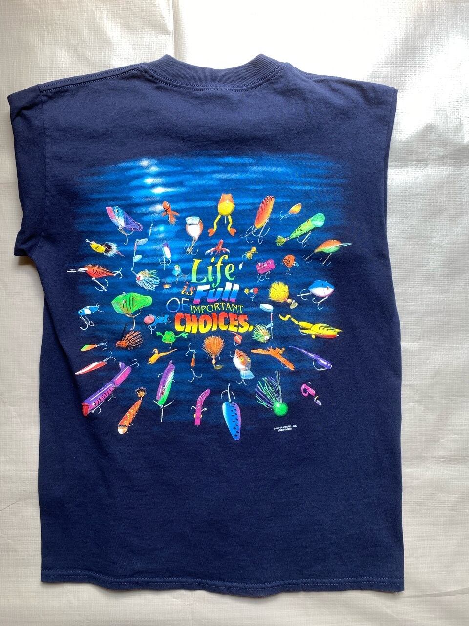 これは『人生は素敵な選択で溢れています』というメッセージのシリーズで、当時いろんなモノが発売されてますが、こちらはバス釣りルアーのプリントになります。90年代のモノで使用感や多少の日焼けなどありますが是非。