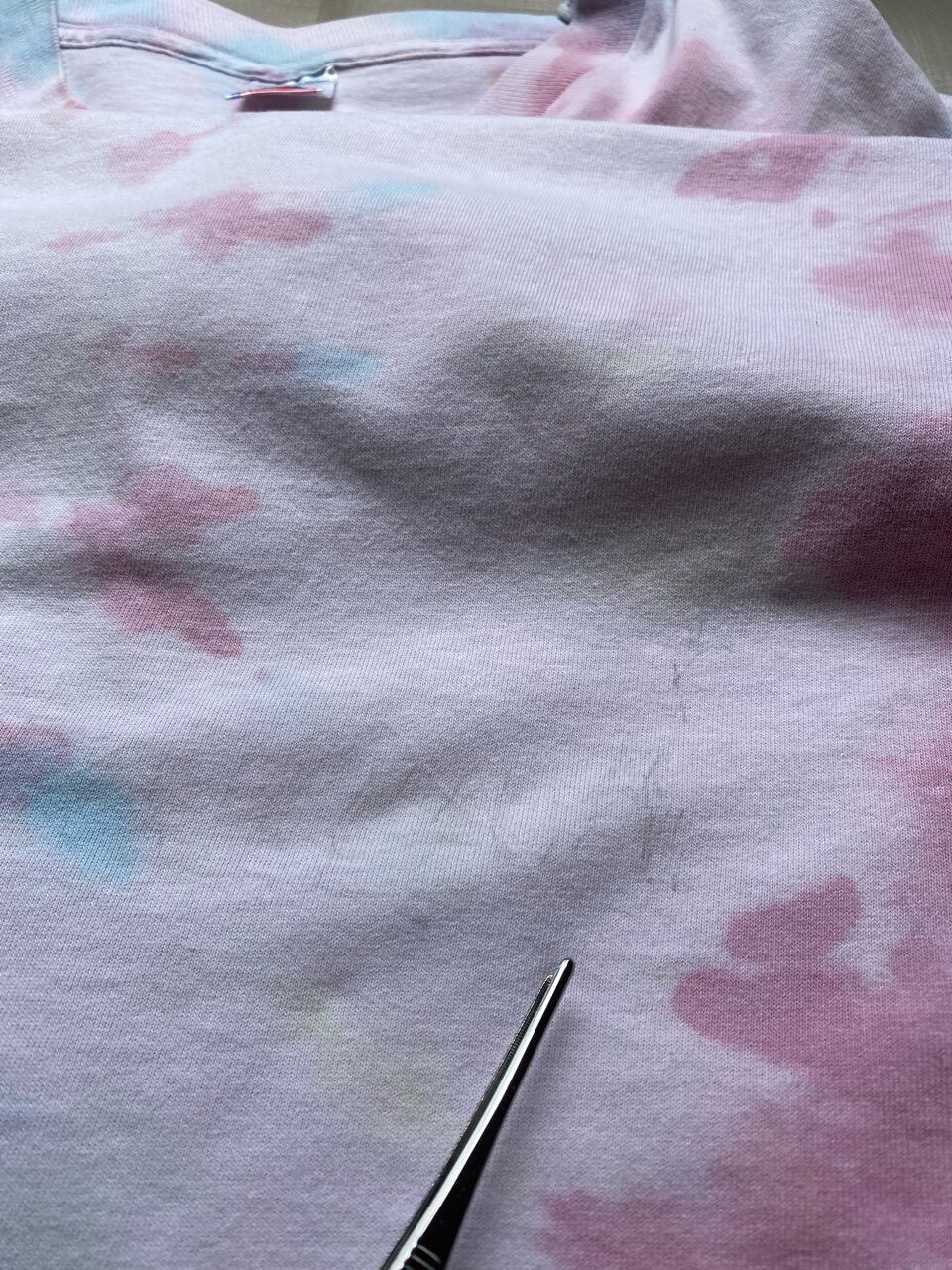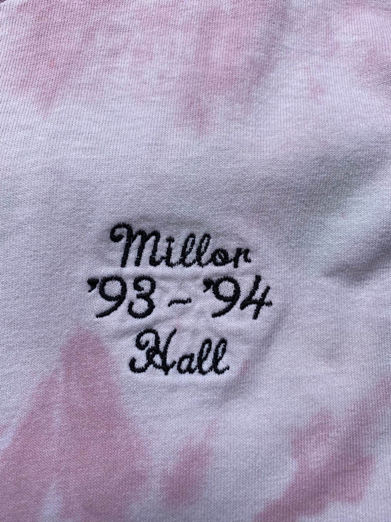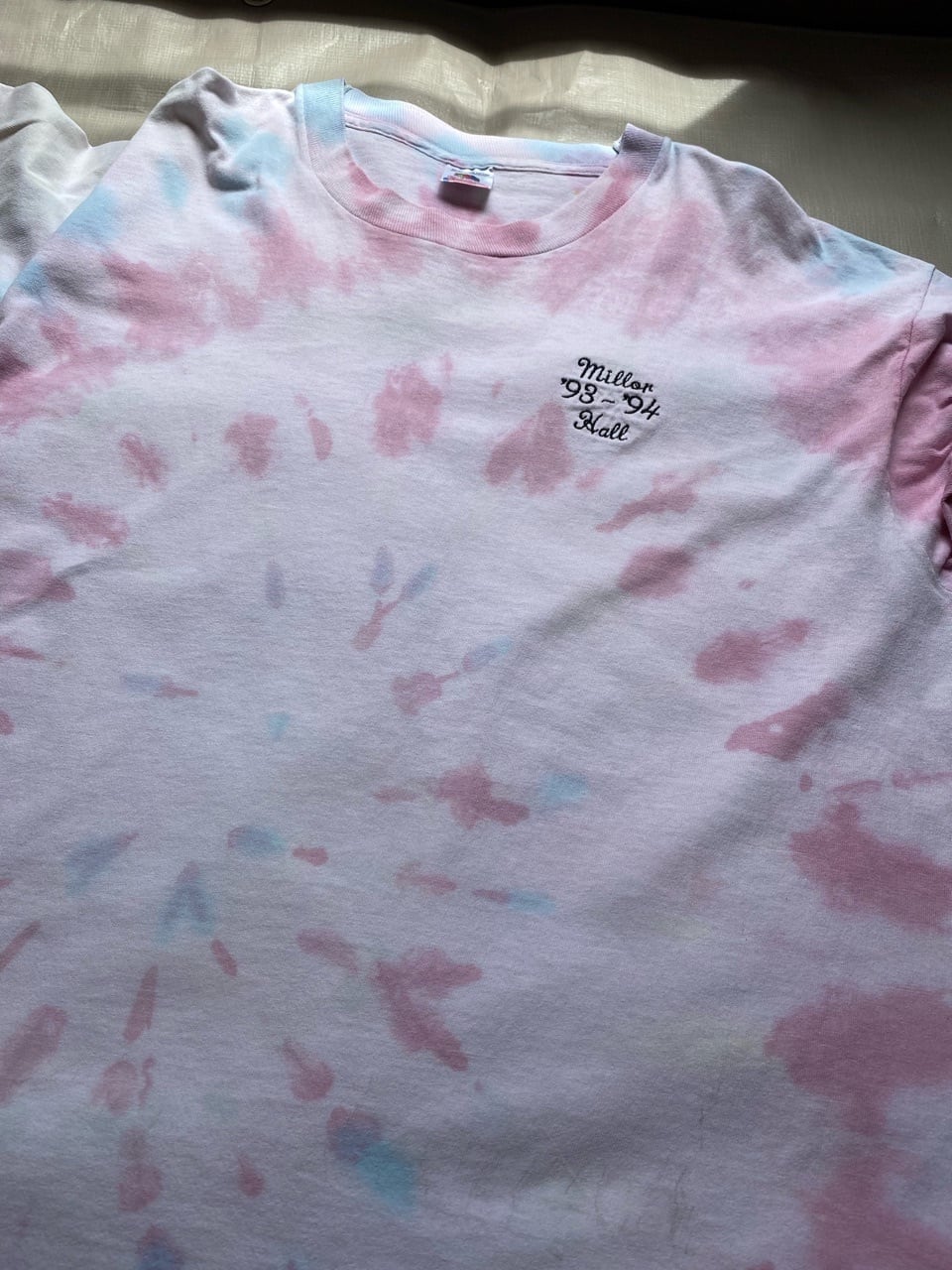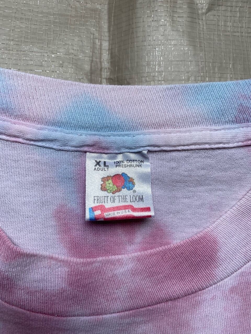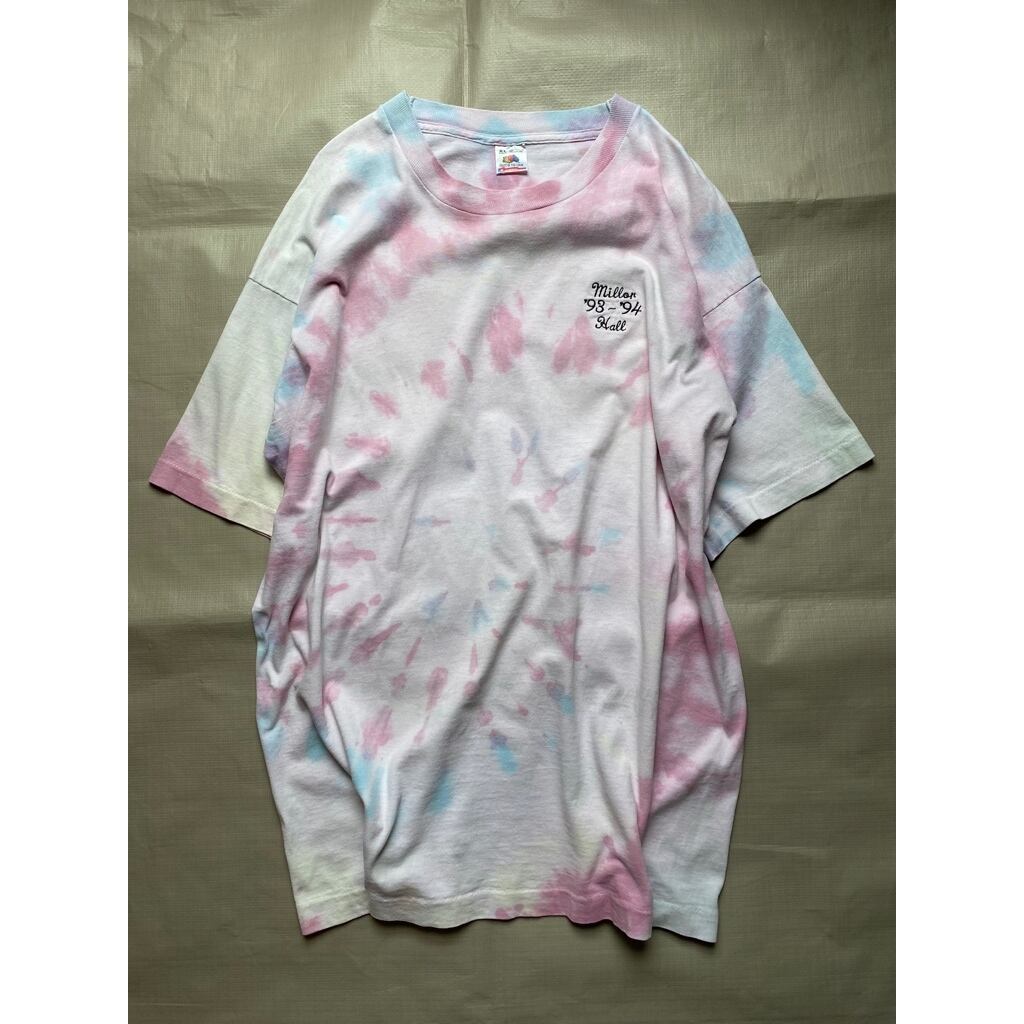 90年代のFRUIT OF THE LOOMのボディを使用し左胸にワンポイント刺繍の入ったタイダイTシャツ。淡いパールカラーでサイズも大きく着やすいタイダイTシャツです。
