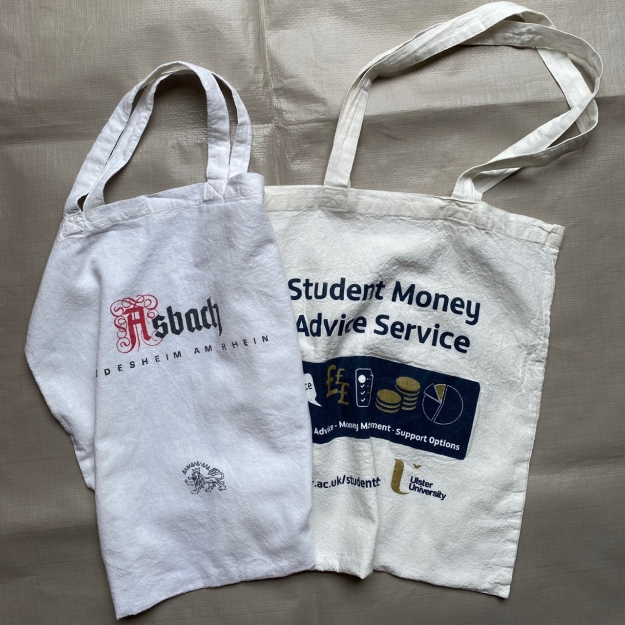 右は北アイルランドのアルスター大学の学生サポート組合のエコバッグで、左はドイツの老舗ブランデーブランドのアスバッハのエコバッグセットです。エコバッグはいくつあっても楽しく便利なアイテムです。