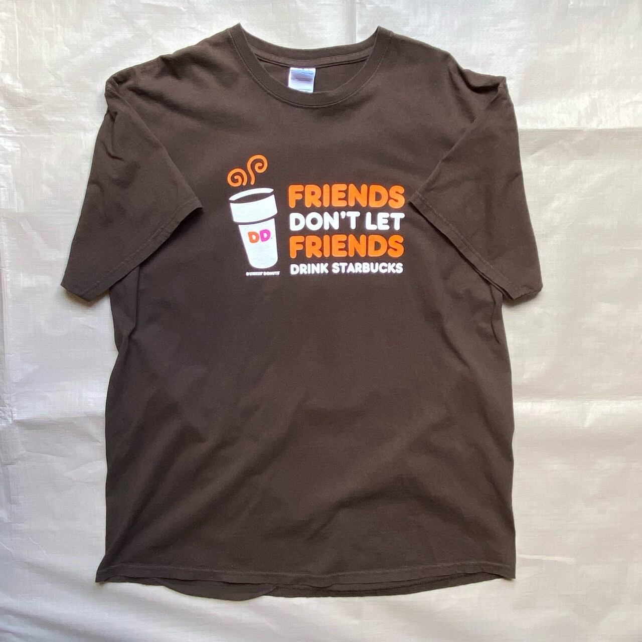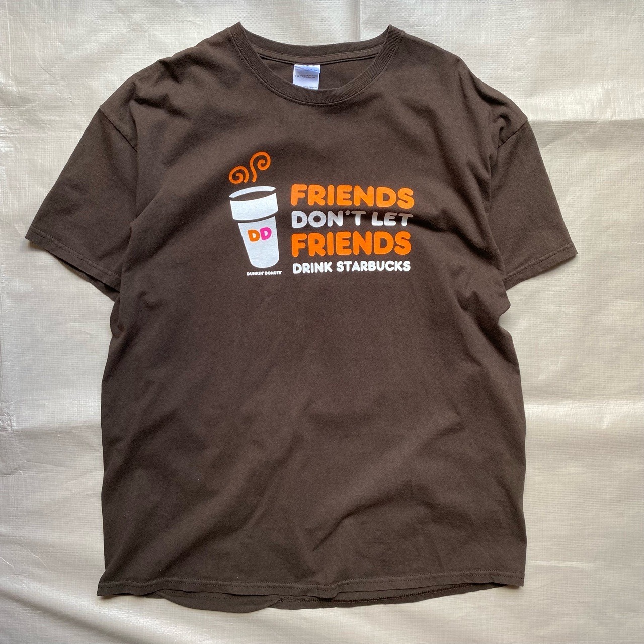 アメリカで1950年に設立されたドーナツメインのファーストフードチェーンのダンキンドーナツのTシャツです。皮肉なメッセージのプリントはなんともかわいい企業Tシャツです。