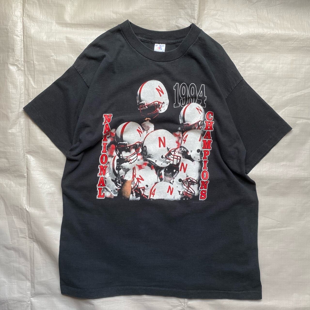 1994年アメリカンフットボール学生チャンピオンのネブラスカ大学の記念プリントTシャツ。迫力あるアメフトデザインがいい感じ。