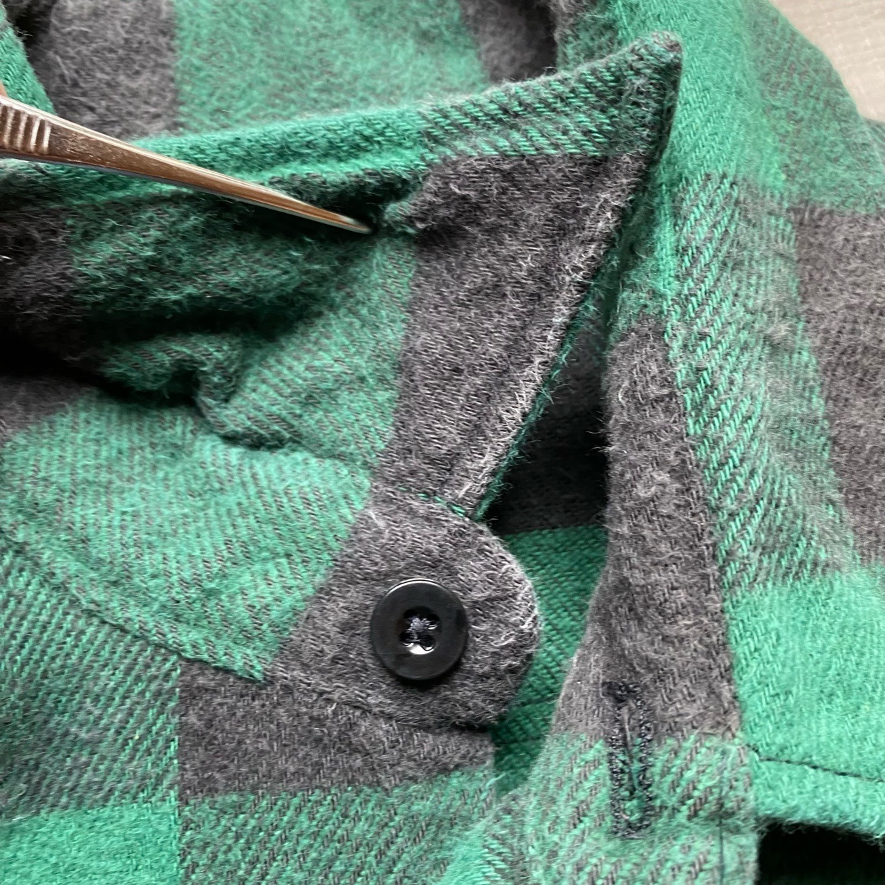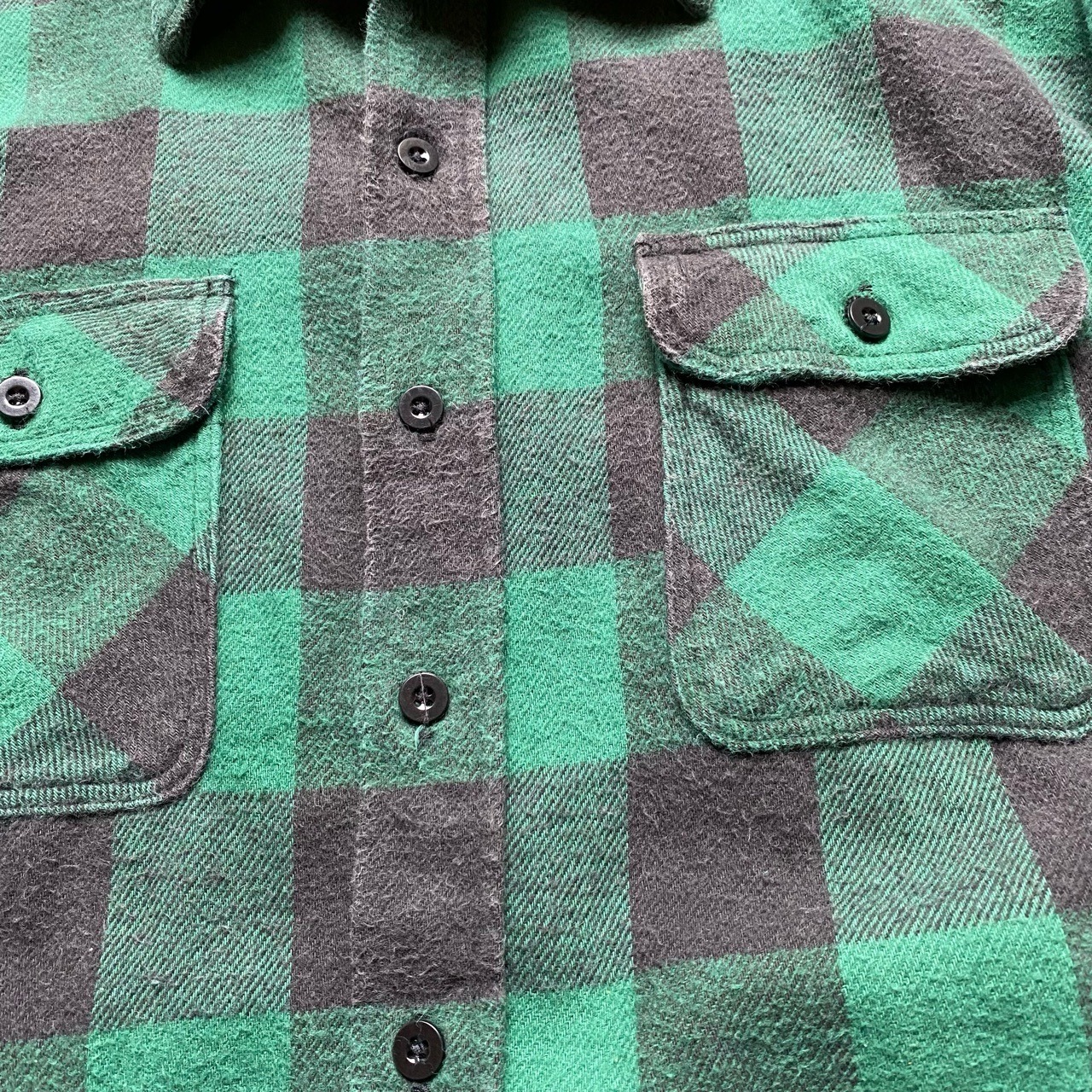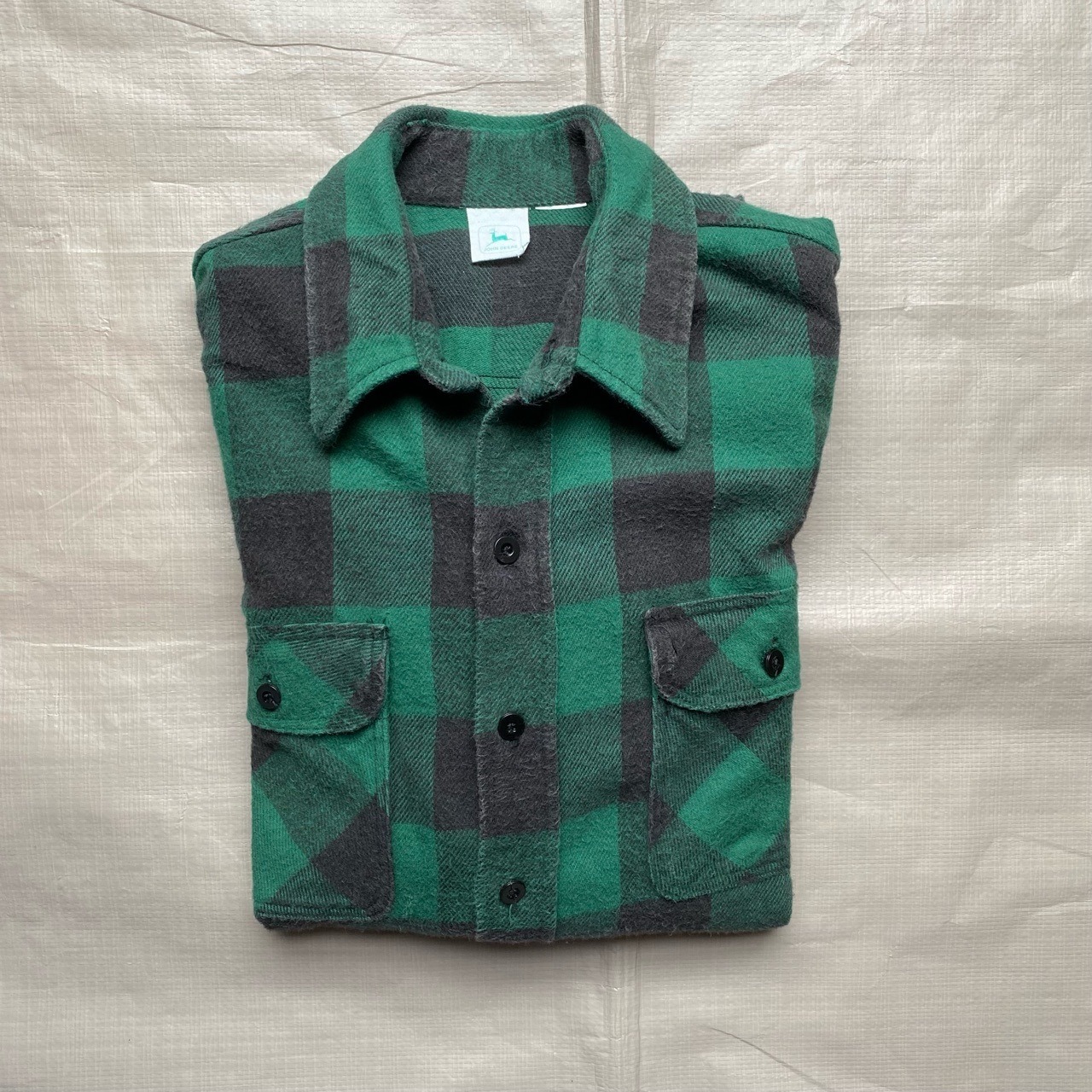 年代は不明ですが、アメリカ イリノイ州に本社を置く農業機械メーカーのジョンディアのバッファローチェックワークシャツです。やや厚手で柔らかいフランネルで襟に芯の入ったワークシャツです。