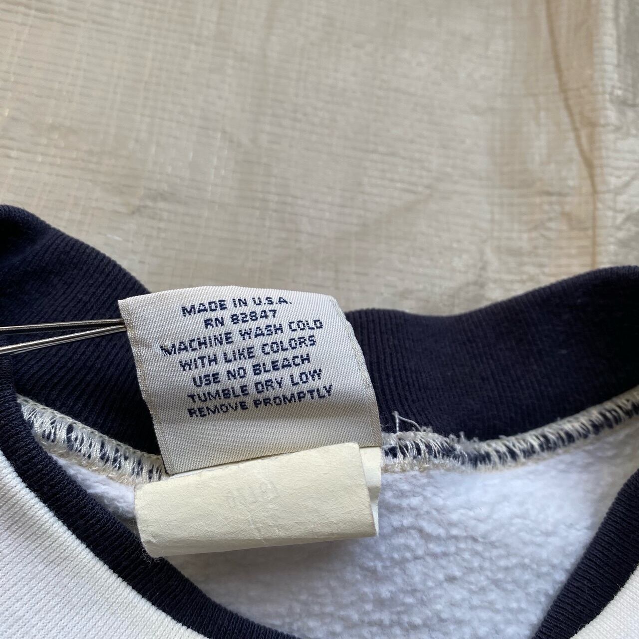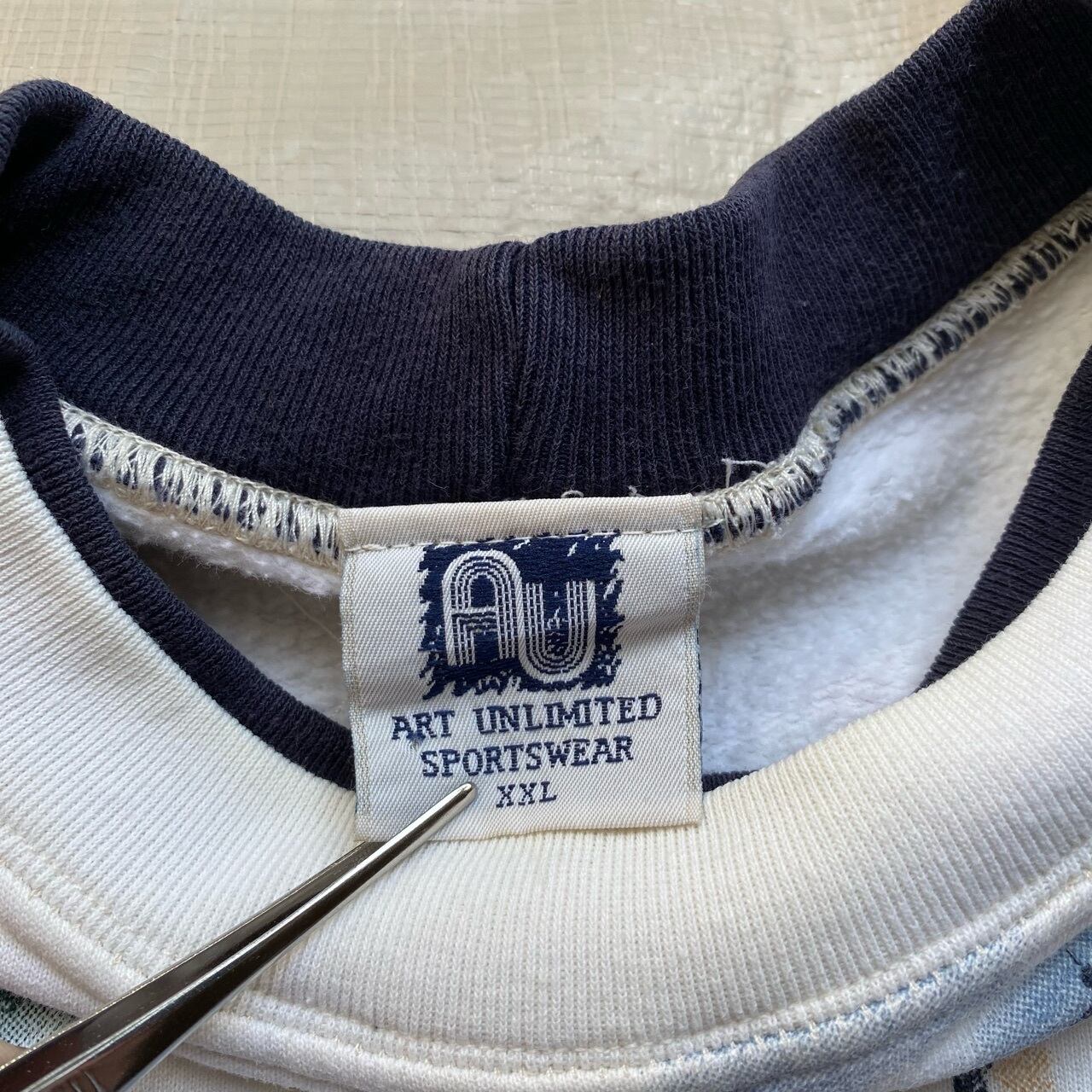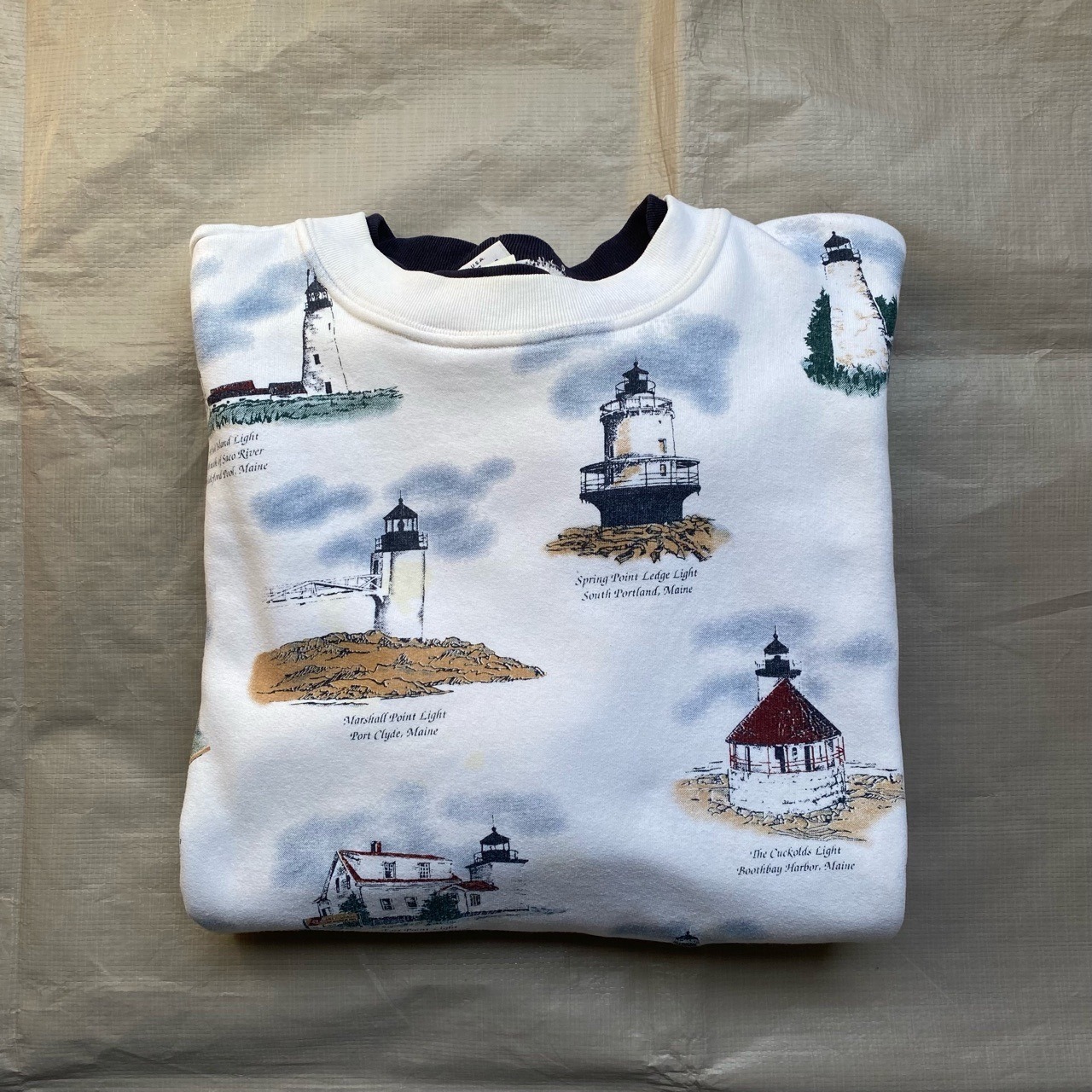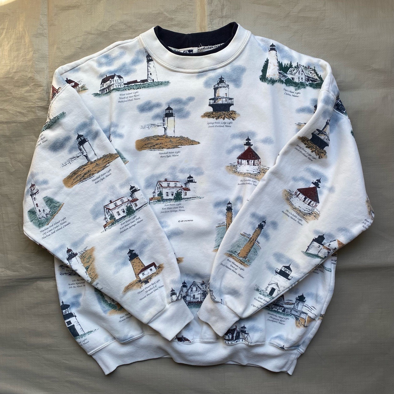 鳥や魚、灯台などの総柄プリントが有名なミシガンラグと同じファクトリーと言われている、アートアンリミテッドの灯台柄スウェットです。襟が二重で横幅がある90年代らしいデザインです。